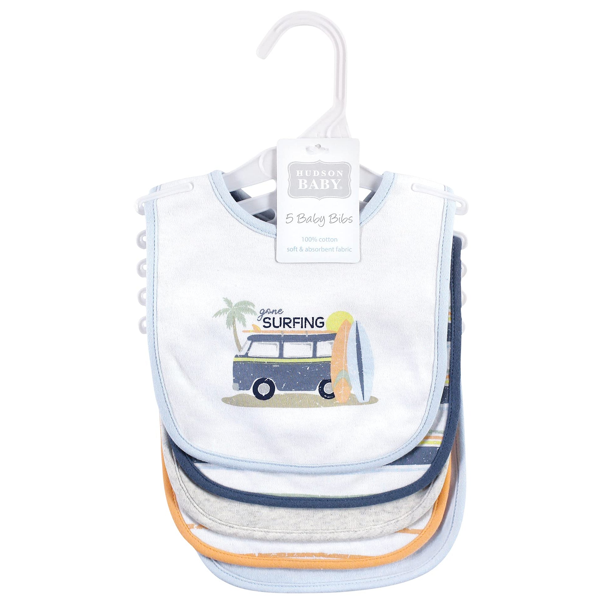 - Q: What designs are available for the Hudson Baby Bibs? A: The Hudson Baby Bibs are available in various designs, including the 'Gone Surfing' theme, which adds a playful element to your baby's outfit.