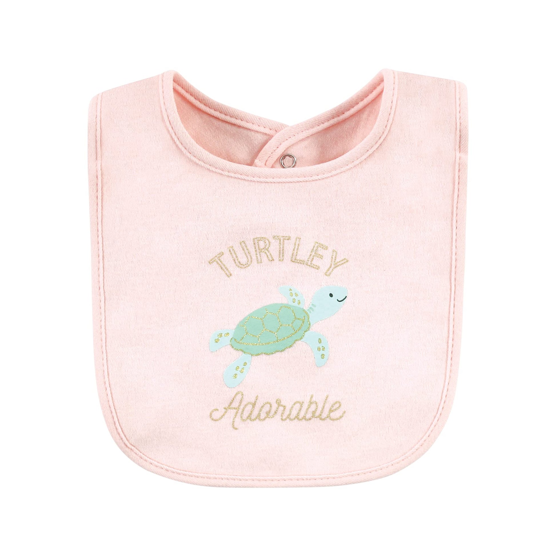 - Q: What is the design on the bibs? A: The bibs feature a cute and playful 'Turtley Adorable' design that adds a fun touch to mealtime.