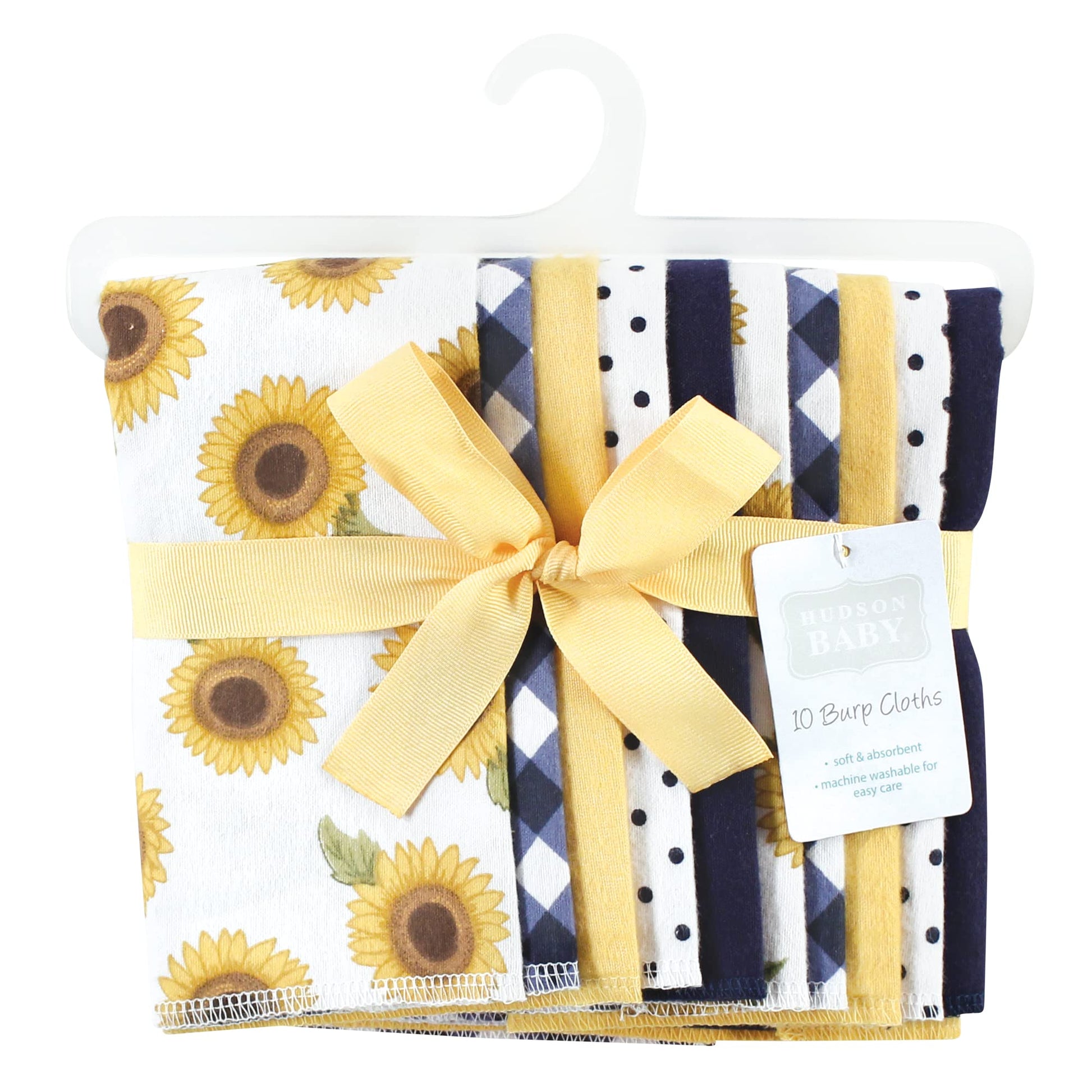 - Q: What colors or patterns are available? A: The Hudson Baby burp cloths are available in various designs, including the Sunflower pattern featured in this product listing.
