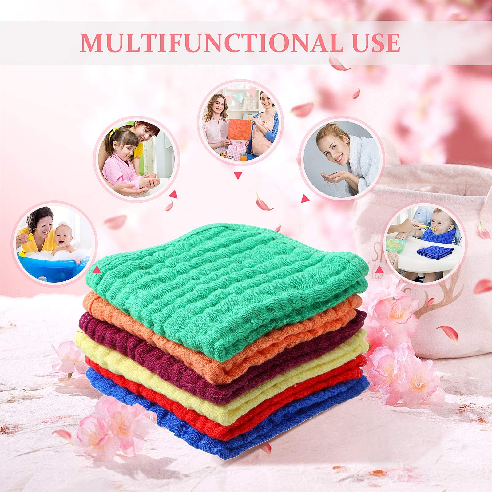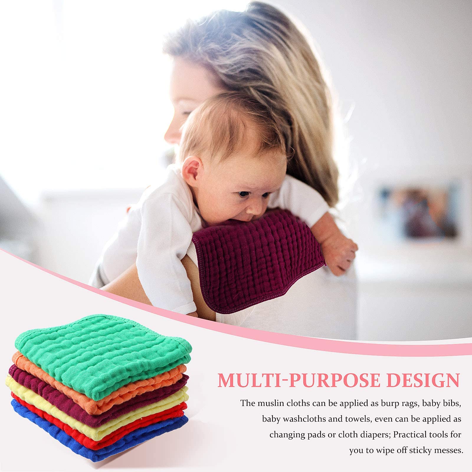 - Q: How many burp cloths are included in one package? A: Each package contains six muslin burp cloths in various colors, providing enough quantity for everyday use.
