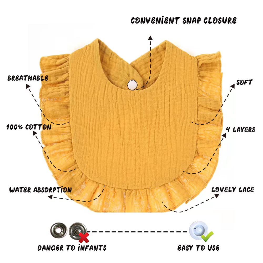 - Q: What makes these bibs special for baby girls? A: These bibs are designed with a flounce edge lace detail, which adds an adorable touch specifically for baby girls.