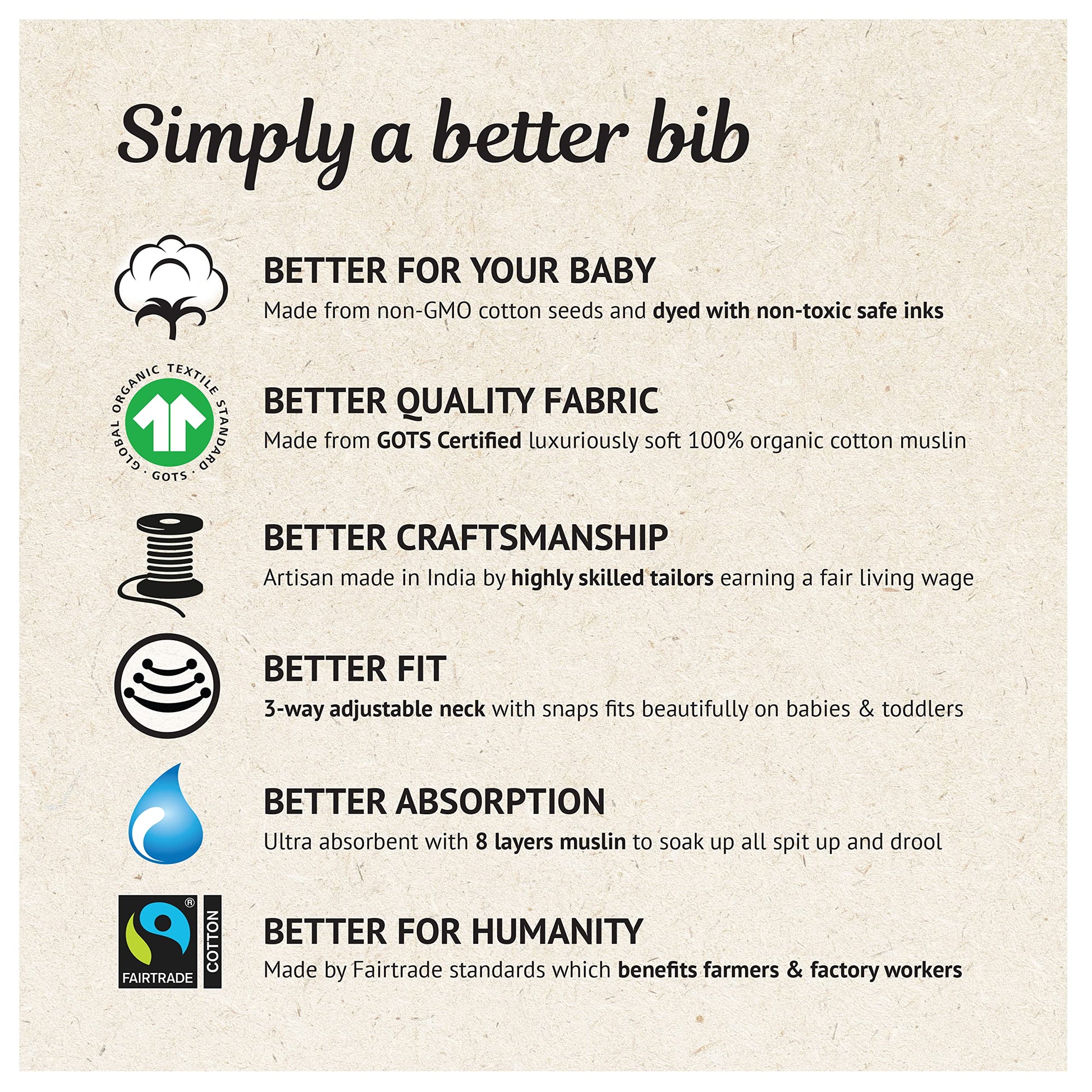 - Q: Is the bib made using sustainable practices? A: Yes, the bib is ethically made in a Fair Trade Certified factory and uses Non-GMO organic cotton, reflecting sustainable practices.