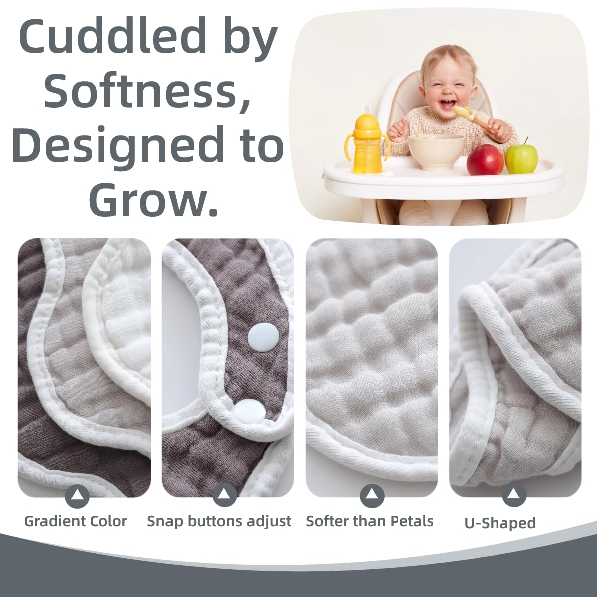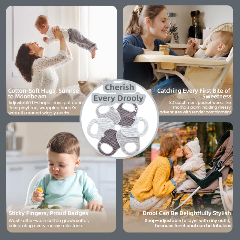 - Q: What material are the bibs made from? A: These bibs are crafted from soft, absorbent cotton muslin fabric, which is gentle on a baby's delicate skin.