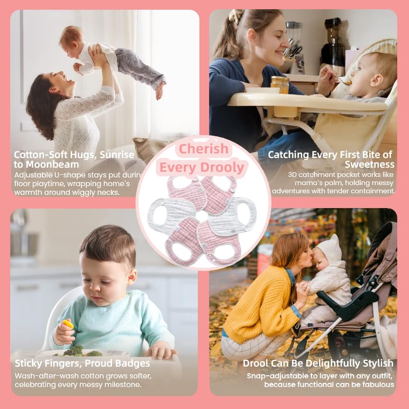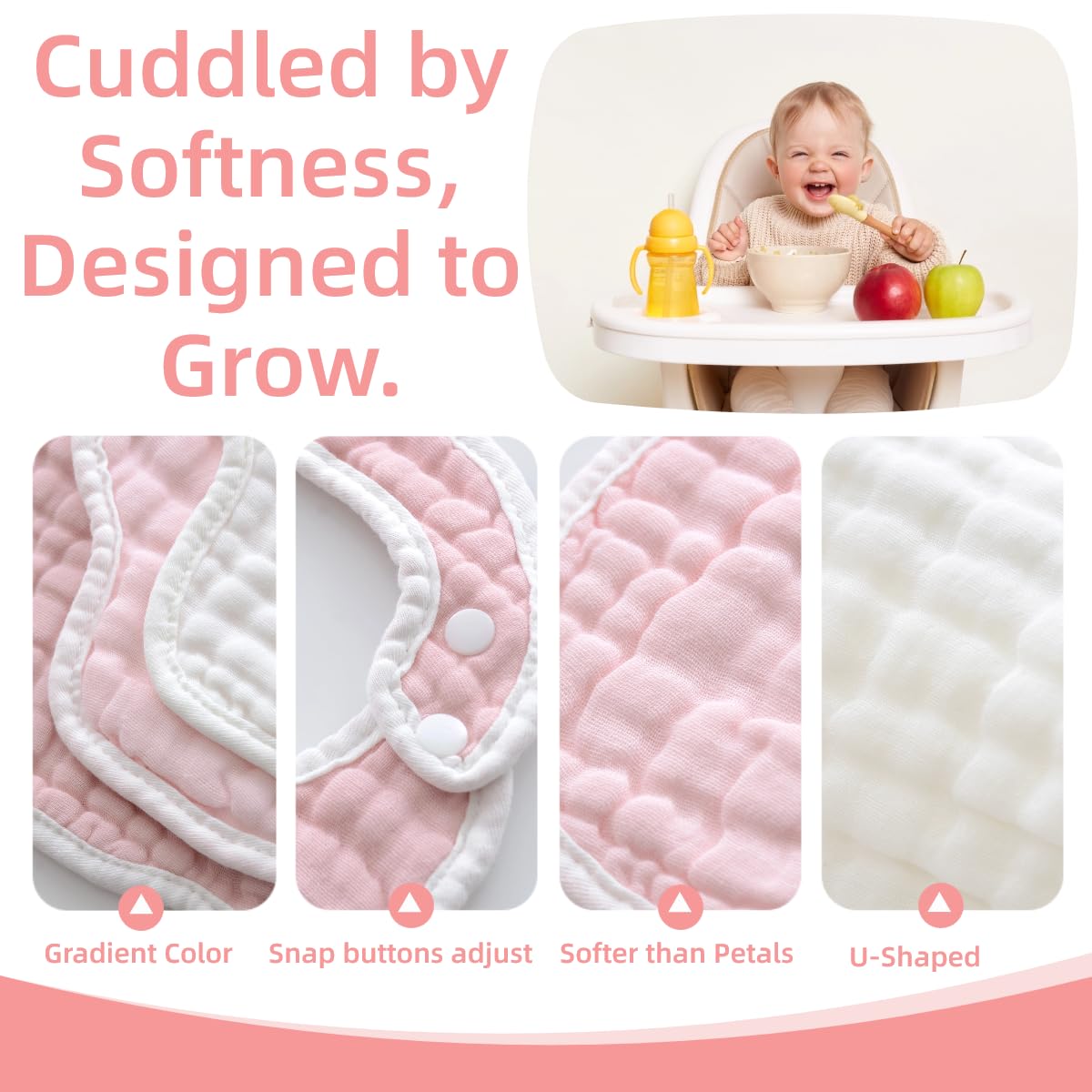 - Q: What makes these bibs absorbent? A: The cotton muslin fabric is designed to quickly soak up messes and spills, making them effective for drooling and teething.