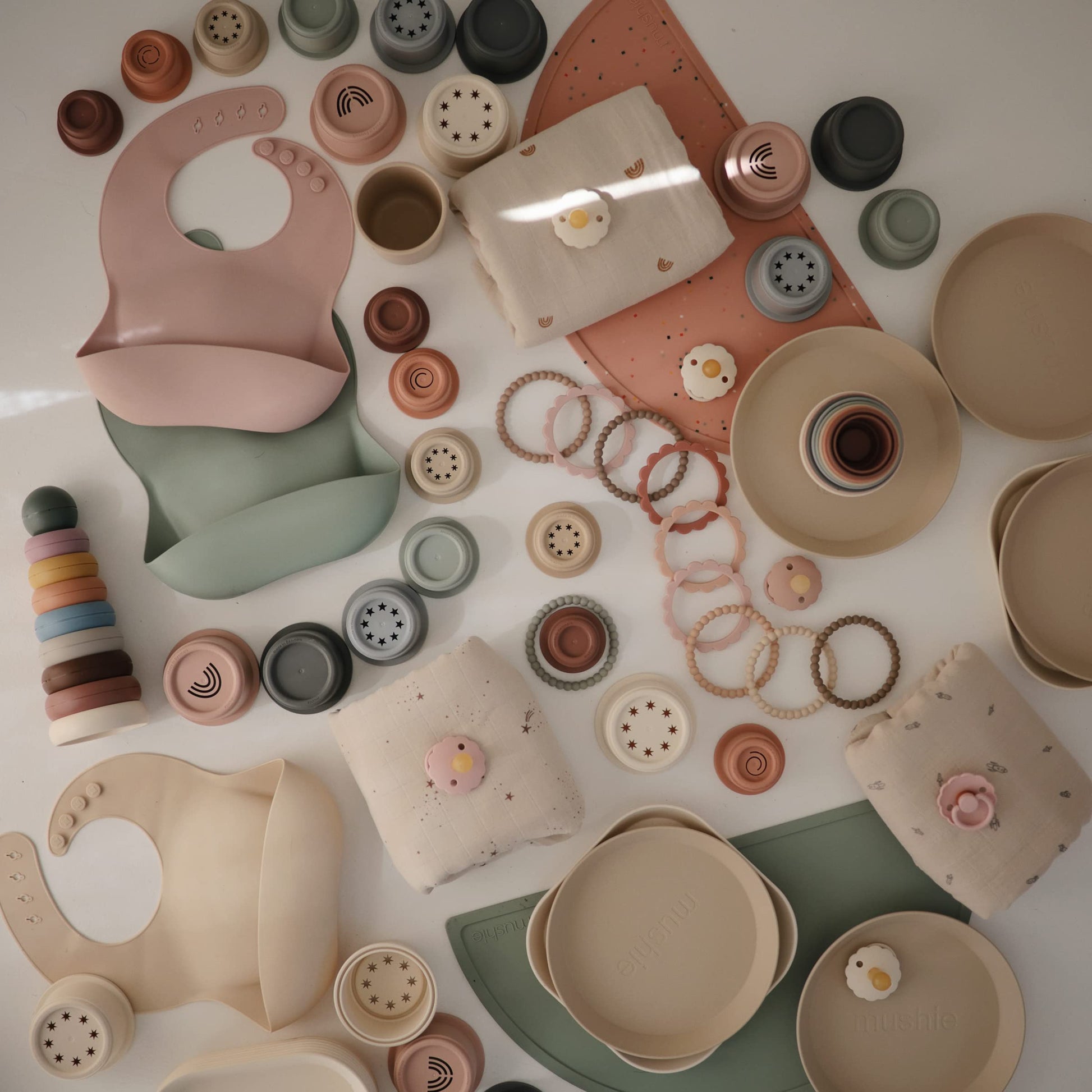 - Q: Does the bib have any special designs or patterns? A: Yes, the mushie Silicone Baby Bib features classic patterns that offer a timeless and elegant look.