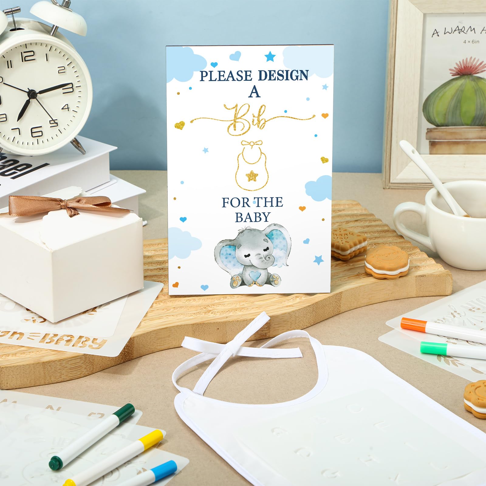 - Q: What is included in the Panitay DIY Baby Bibs Decorating Kit? A: The kit includes 50 white baby bibs, 25 different painting stencils, 24 fabric markers in 12 ink colors, and 1 wooden baby shower game sign.