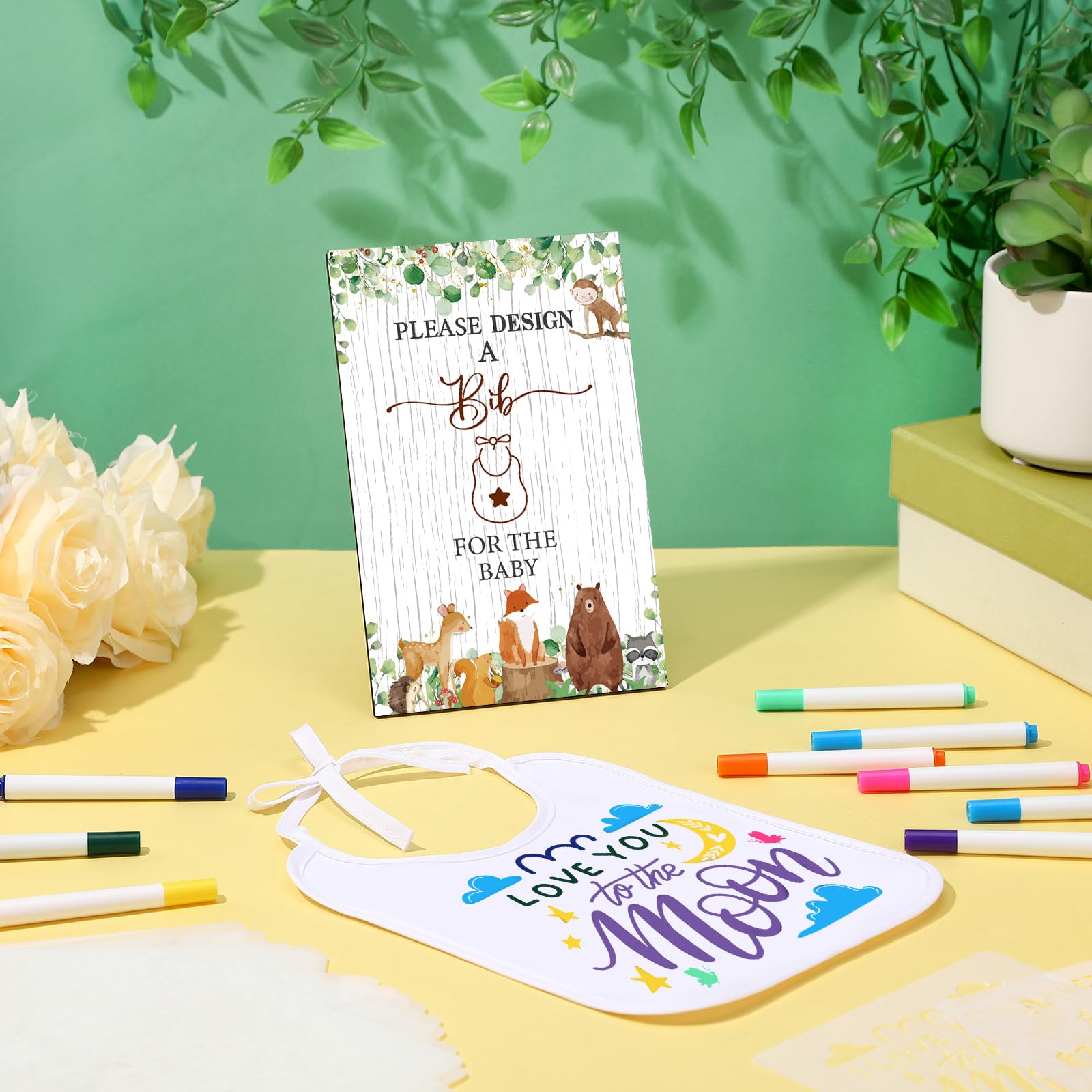 - Q: What is included in the Panitay DIY Baby Bibs Decorating Kit? A: The kit includes 50 white baby bibs, 25 stencils, 24 fabric markers in 12 different colors, and 1 wooden baby shower game sign.