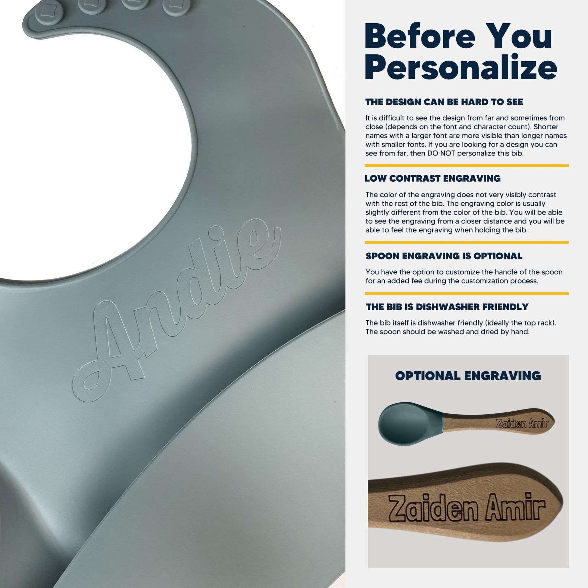 - Q: Can the bib and spoon be personalized? A: Yes, both the bib and the spoon can be personalized with your baby's name engraved in a debossed style, adding a unique touch.