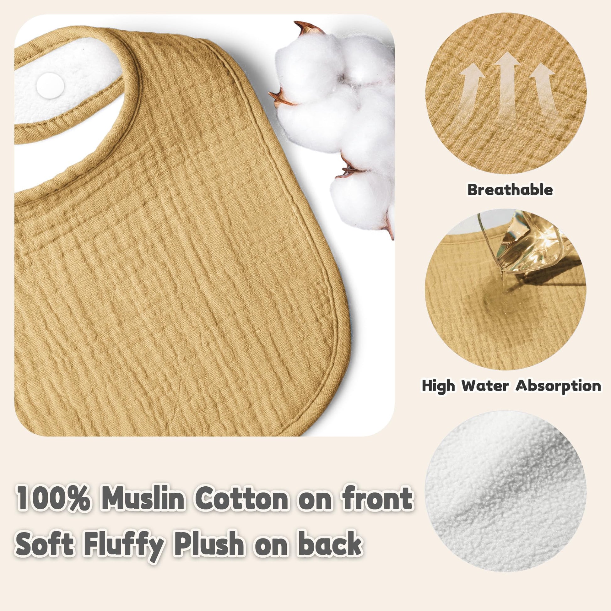 - Q: What materials are the Susurration Muslin Baby Drool Bibs made from? A: The Susurration Muslin Baby Drool Bibs are made from muslin cotton on the front and backed with water-resistant soft plush for maximum absorption.