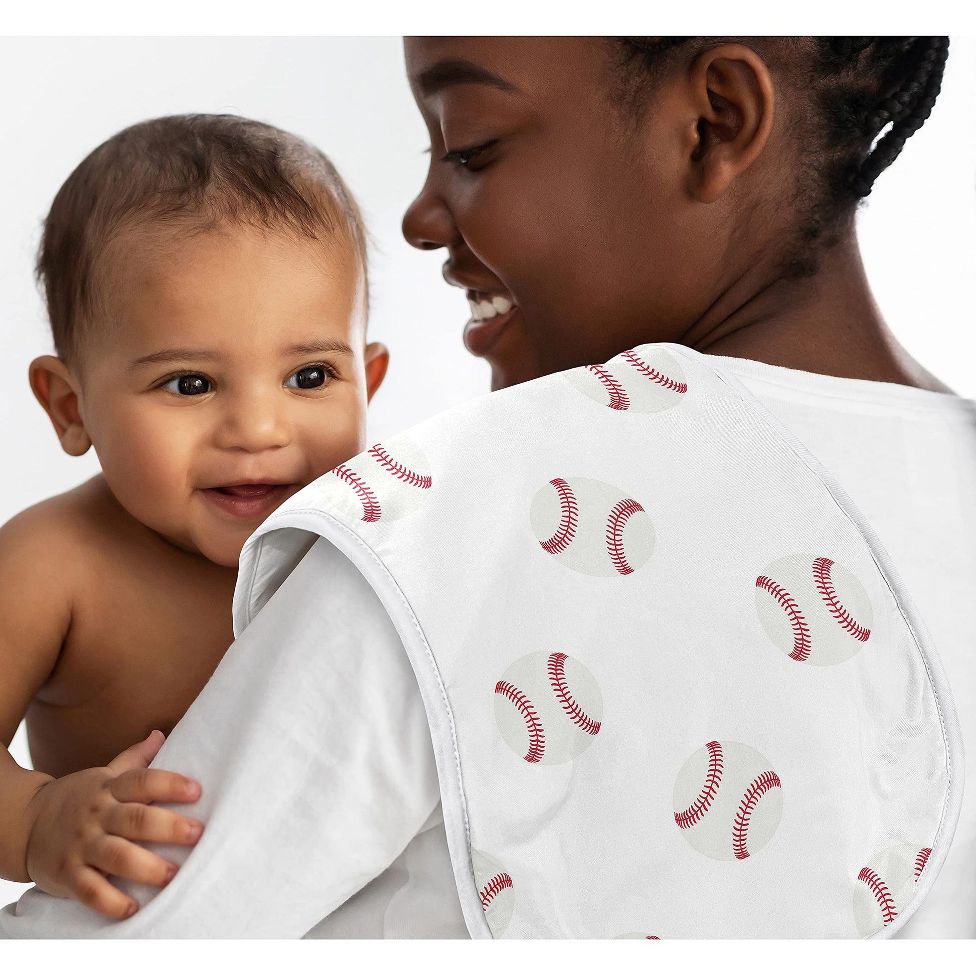 - Q: What is the design of the burping cloths? A: The burping cloths feature a stylish hourglass design and come in coordinating fabrics, including red and white baseballs, grey and white stripes, and solid navy blue.