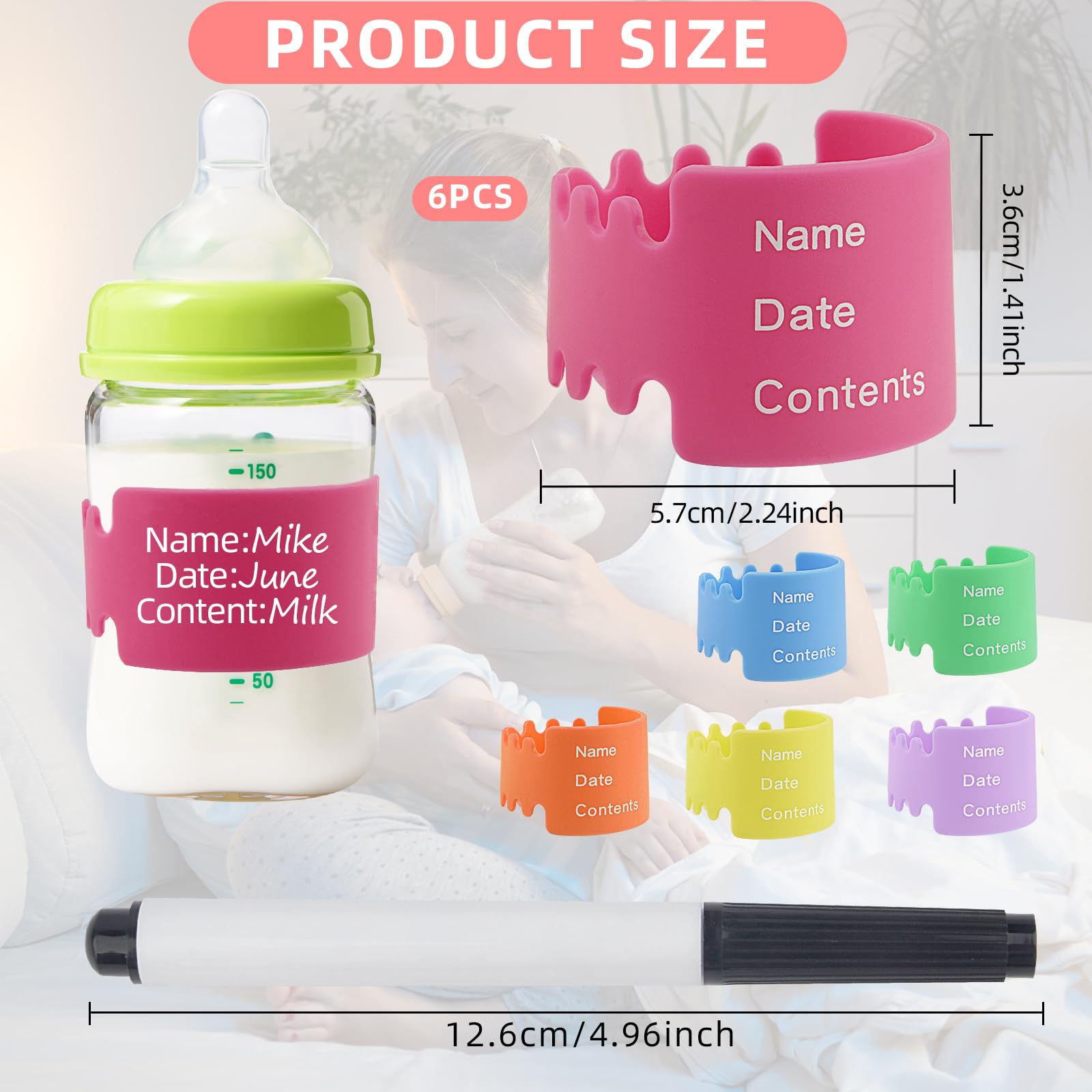 - Q: What colors are included in the set of baby bottle labels? A: The set includes 6 silicone baby bottle labels in different colors, providing a variety of options to meet your baby's daily needs.