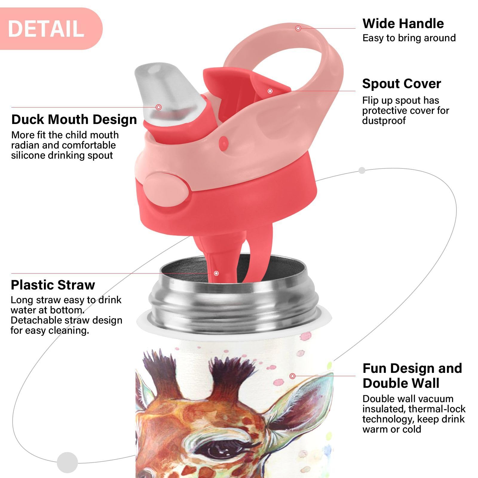 Giraffe Kids Water Bottle With Straw And Carry Handle Cute Animals Vacuum Insulated Stainless Steel Bottles Leak-Proof For Boys