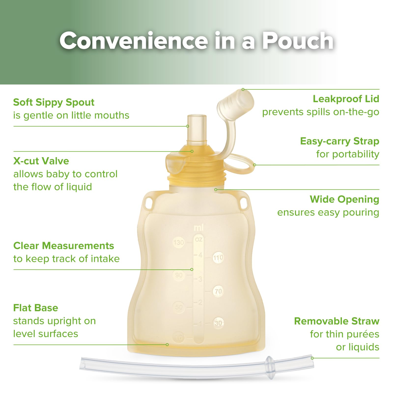 - Q: What features make these pouches ideal for self-feeding? A: The Haakaa Baby Food Pouches have a variable flow opening and a soft silicone spout, encouraging safe, self-paced feeding for your child.