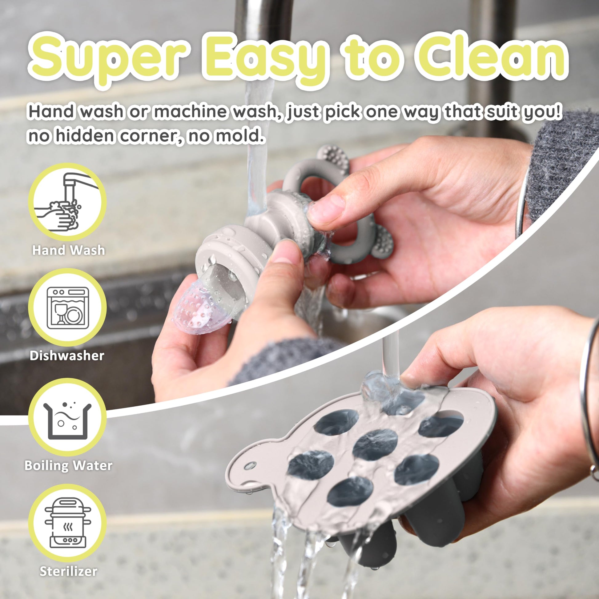 • Q: Can the baby feeder help with teething? A: Yes, the silicone baby feeder can be used to provide soothing relief for sore gums while also allowing safe self-feeding.