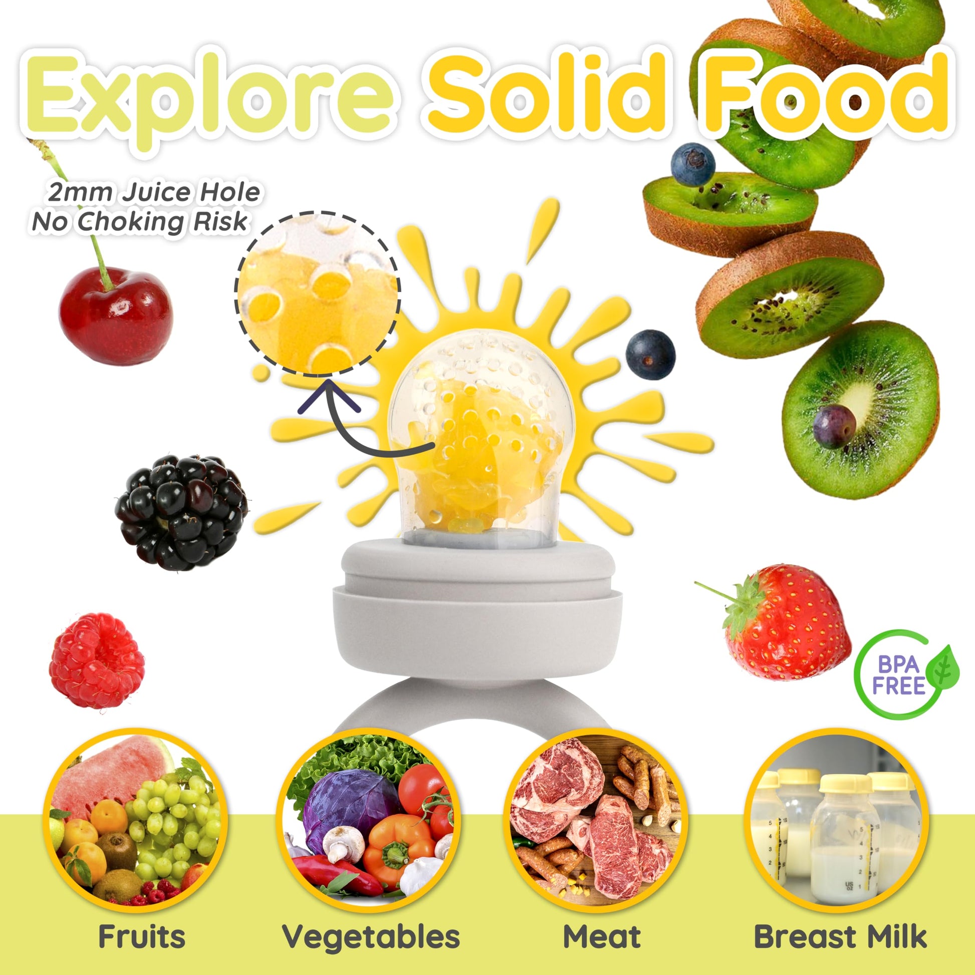 • Q: Can I use the fruit feeder for purees? A: Absolutely! The fruit feeder is designed to be filled with fruits, purees, or smoothies, allowing your baby to explore new flavors safely.