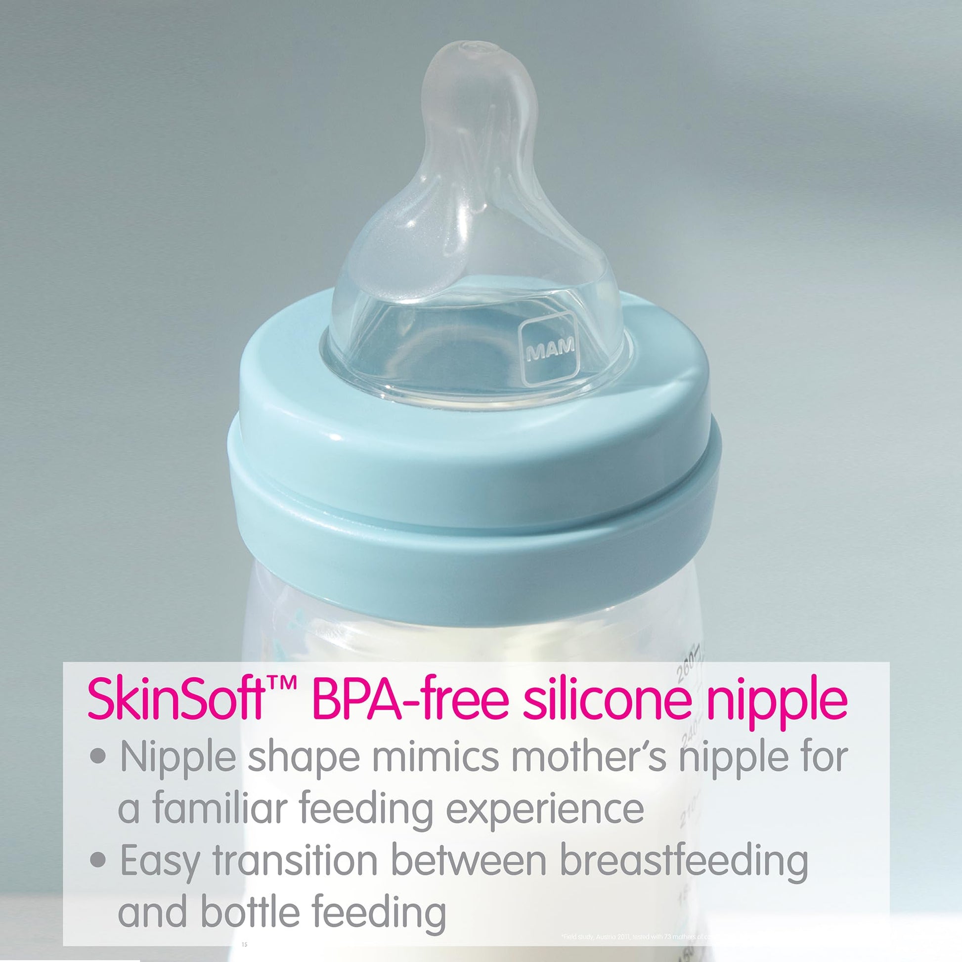 - Q: What materials are used in the MAM nipples? A: The MAM nipples are made from SkinSoft silicone, which feels similar to a mother's skin, enhancing the baby's comfort during feeding.