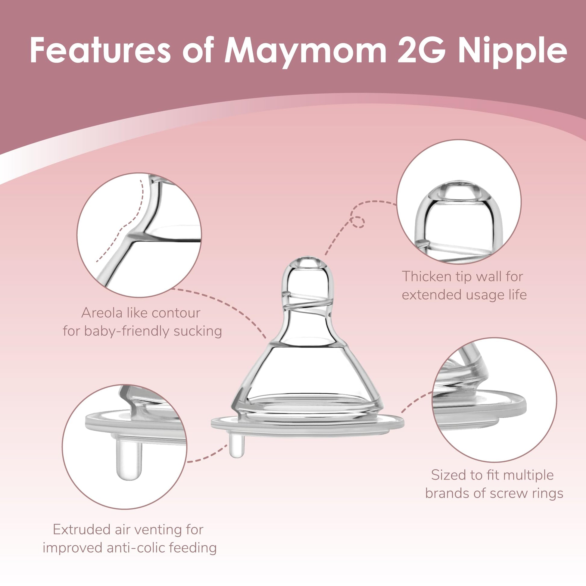 • Q: What makes the 2nd generation of this nipple different? A: The 2nd generation of the Maymom Silicone Nipple includes improvements for better air venting and reduces the chance of nipple collapse during feeding.