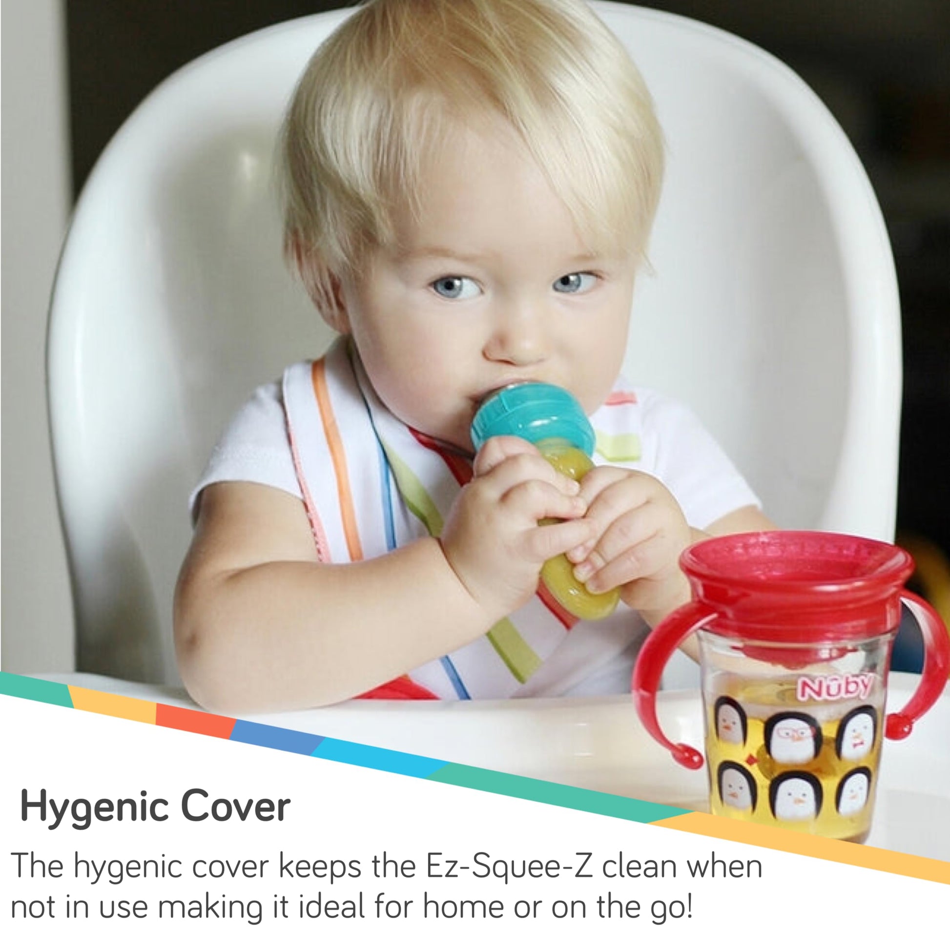 - Q: Is the Nuby EZ Squee-Z easy to clean? A: Yes, the soft silicone material is easy to clean, and it includes a hygienic cover to keep the feeding pouch clean when not in use.