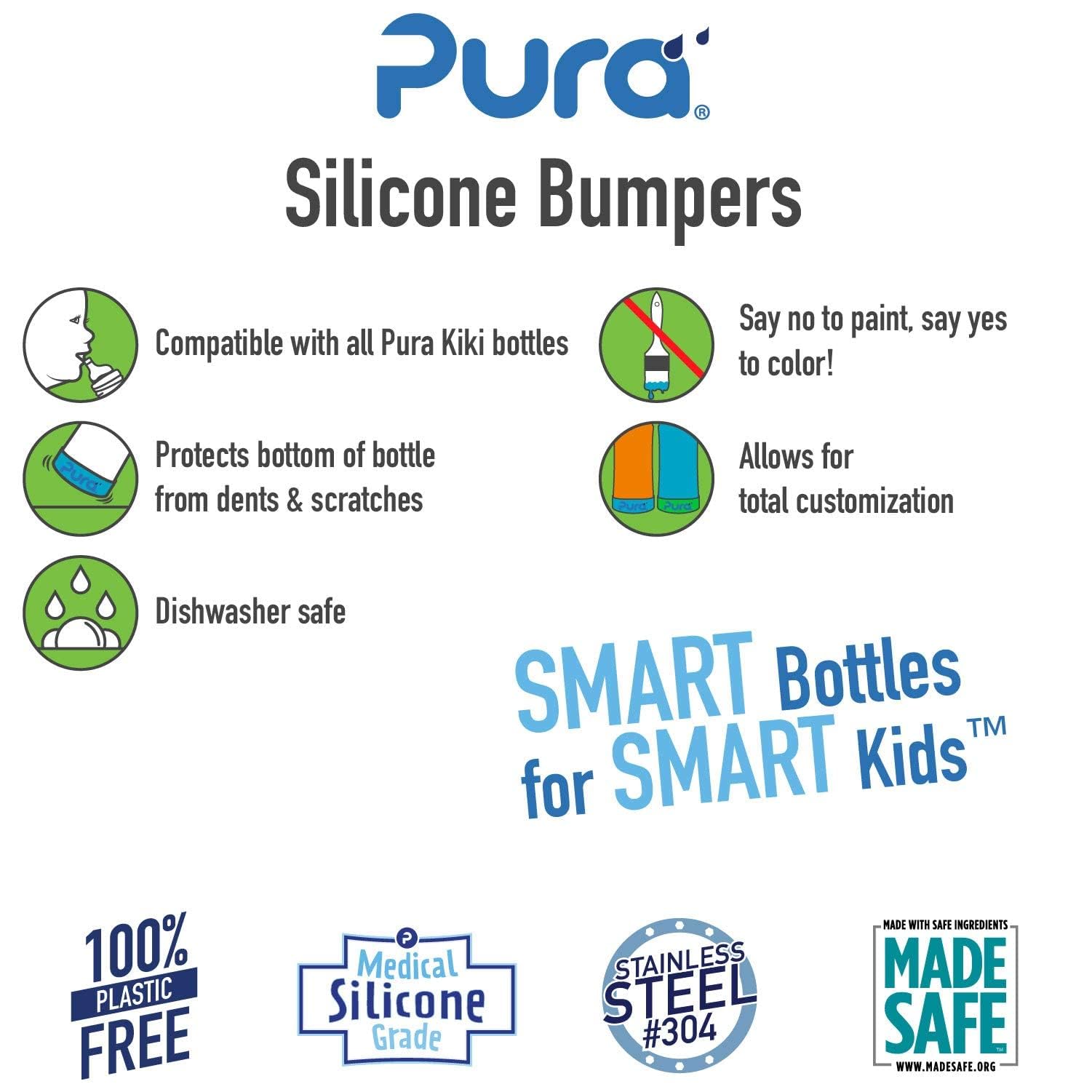 • Q: What is the Pura Kiki Silicone Bottle Bumper made of? A: The Pura Kiki Silicone Bottle Bumper is made from medical-grade silicone that is 100% plastic-free and does not contain BPA, BPS, EA, PVC, phthalates, or other toxins.