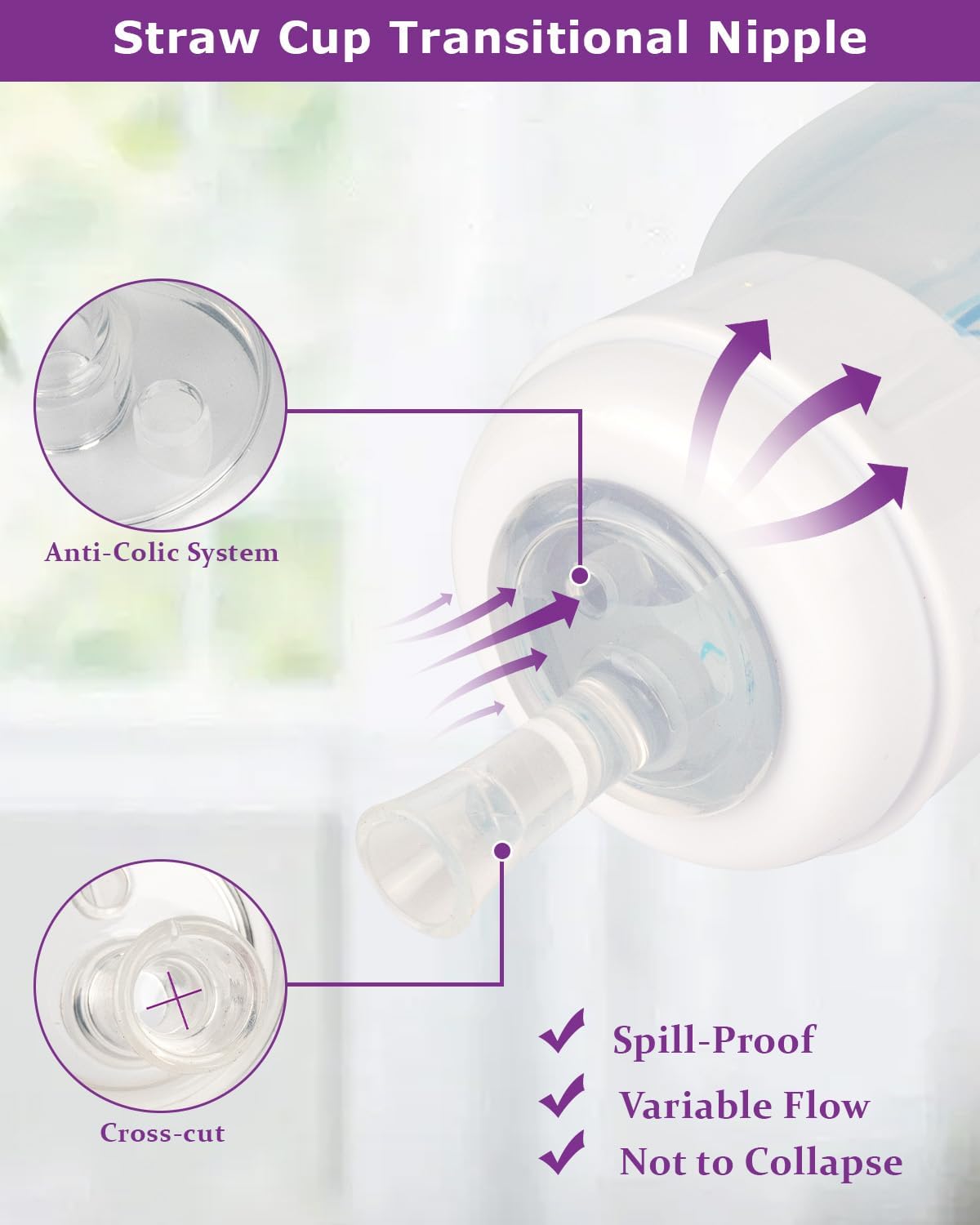 - Q: How does this nipple help with transitioning from bottle to cup? A: The transitional design of the nipple helps babies gradually learn to drink from a straw, promoting independence and building their drinking skills.