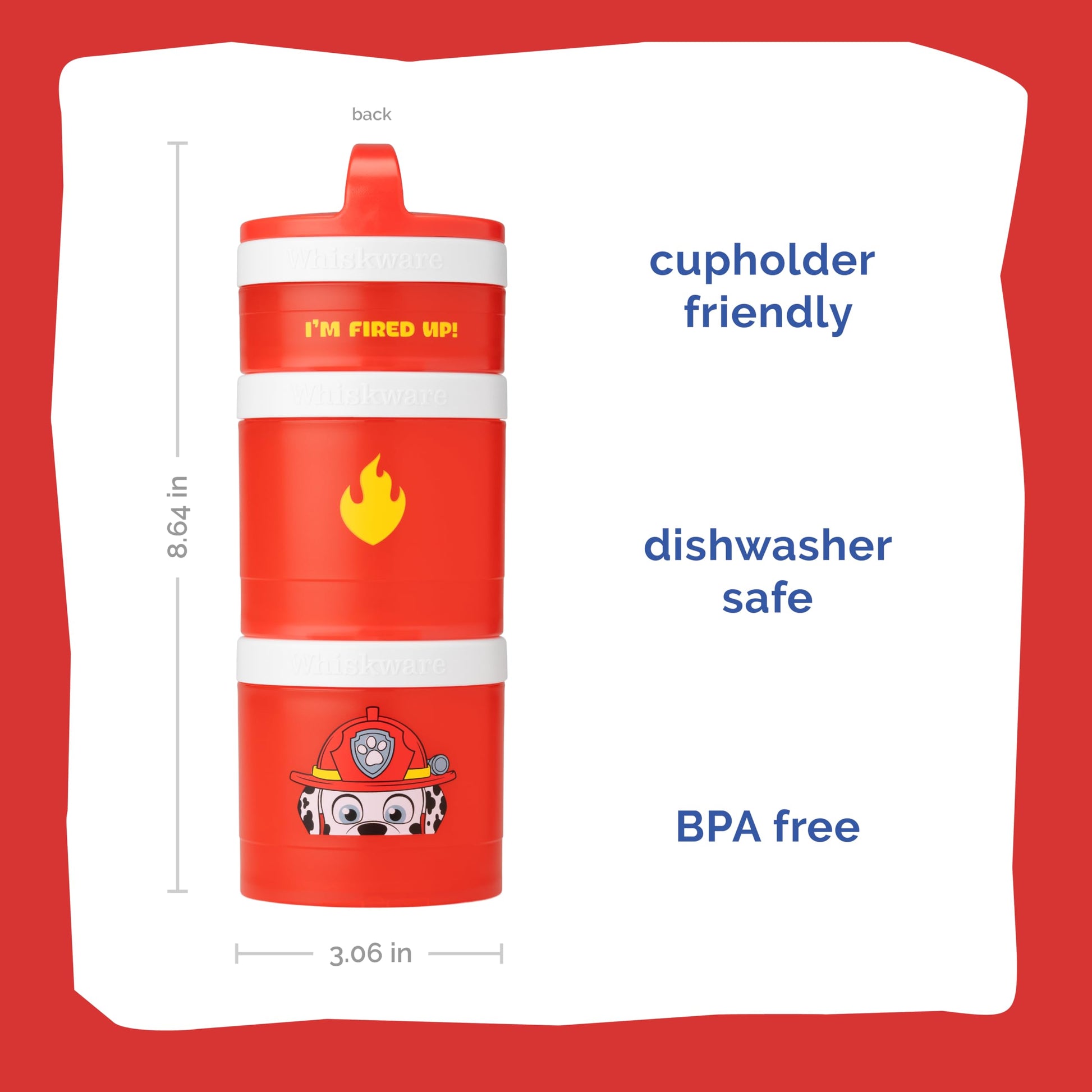 - Q: What are the dimensions of the Whiskware Paw Patrol Stackable Snack Containers? A: The snack containers include three jars: one measuring 1/3 cup, one measuring 1 cup, and another also measuring 1 cup.