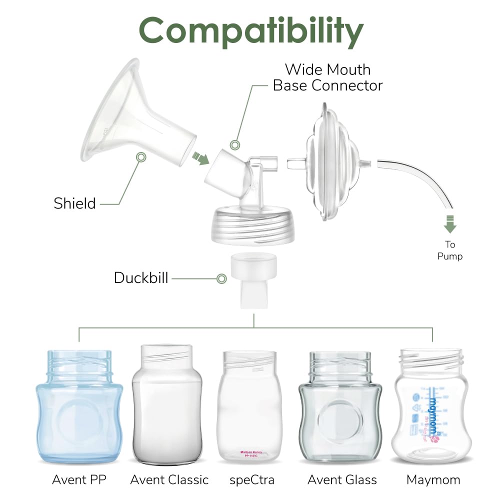 • Q: What is included in the Maymom pump parts set? A: The set includes 2 shields (14 mm), 2 wide-mouth connectors, and 2 duckbills (3rd Gen), providing everything needed for effective pumping.