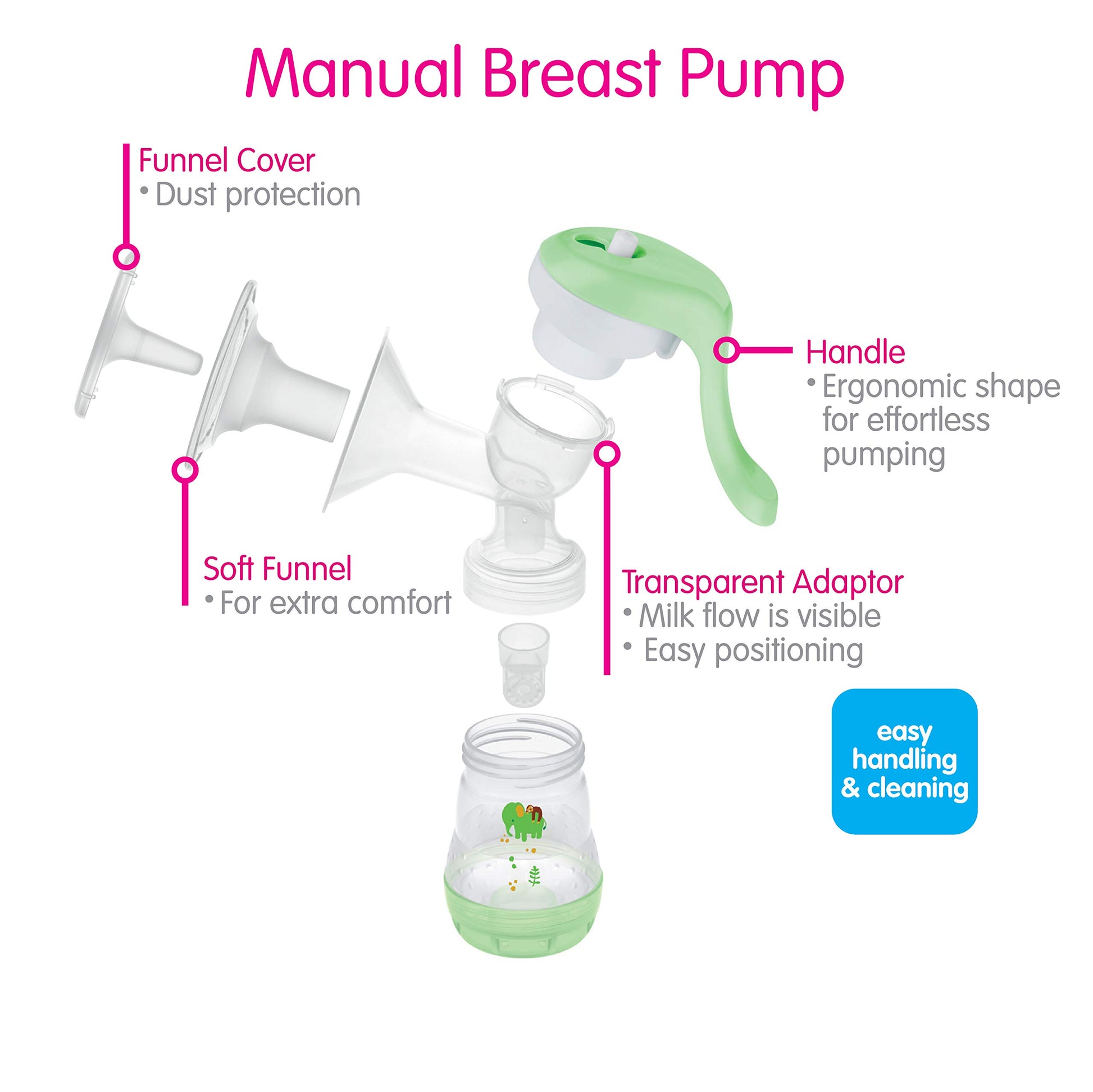- Q: What features enhance comfort when using the MAM Manual Breast Pump? A: The pump features an ergonomic handle for effortless pumping and a removable soft funnel made of extra soft silicone for comfortable milk expression.