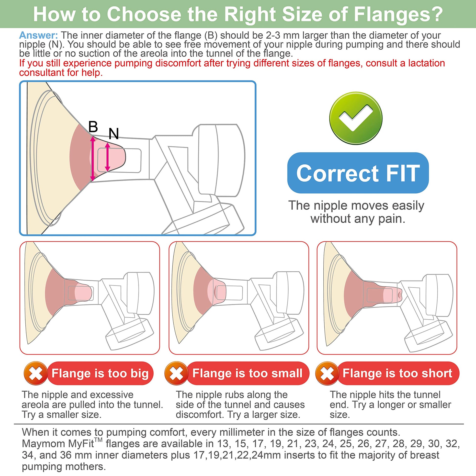 - Q: How do I choose the correct size flange for my breast pump? A: To choose the correct size flange, measure your nipple diameter after a pumping session and select a flange size that is 1-2 millimeters larger than your measurement.