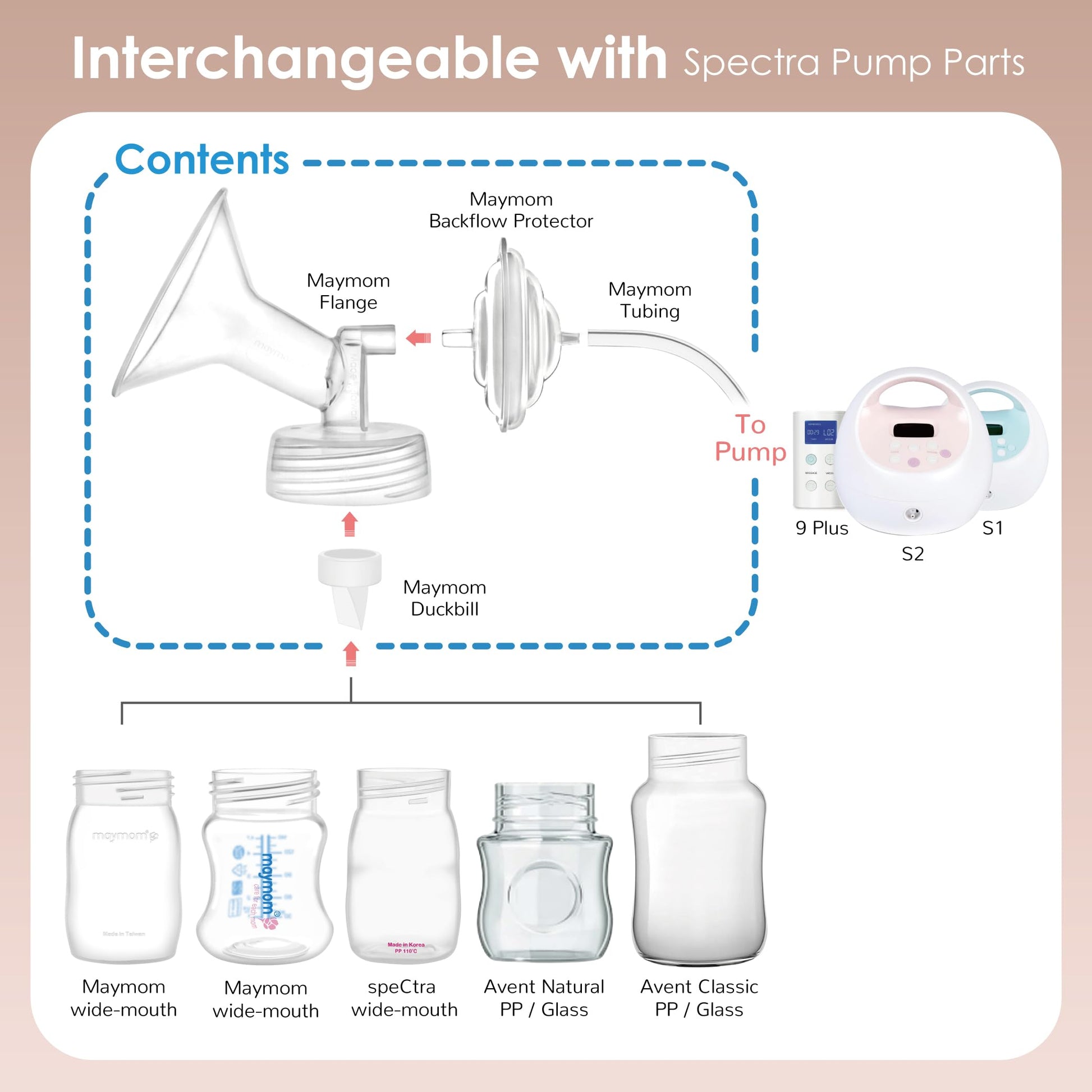 - Q: What is included in the Maymom pump parts kit? A: The kit includes two wide mouth flanges, two tubing pieces, two backflow protectors, and two duckbill valves.