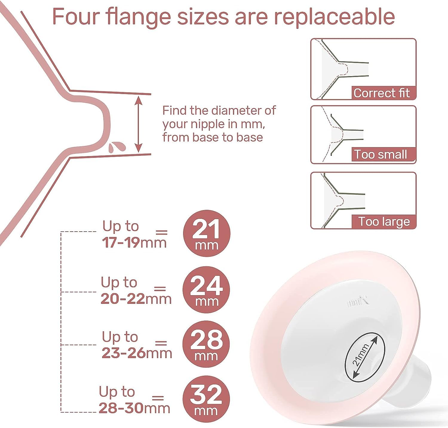 - Q: How many flanges are included with the breast pump, and what sizes do they come in? A: The breast pump comes with four flanges in sizes 21mm, 24mm, 28mm, and 32mm, catering to different breast sizes for optimal comfort and fit.