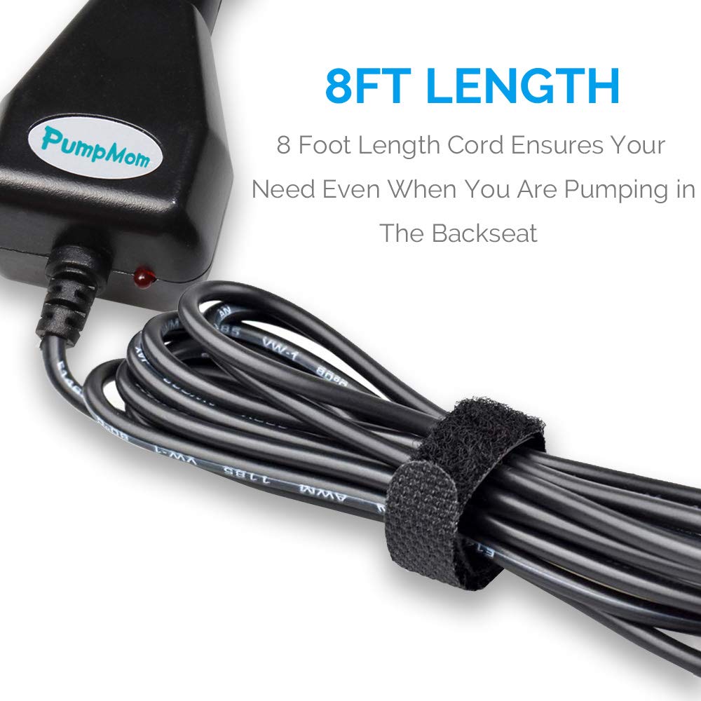 • Q: How long is the cord of the PumpMom Car Adapter? A: The PumpMom Car Adapter features an eight-foot long cord, providing ample length for comfortable pumping in the backseat of your vehicle.