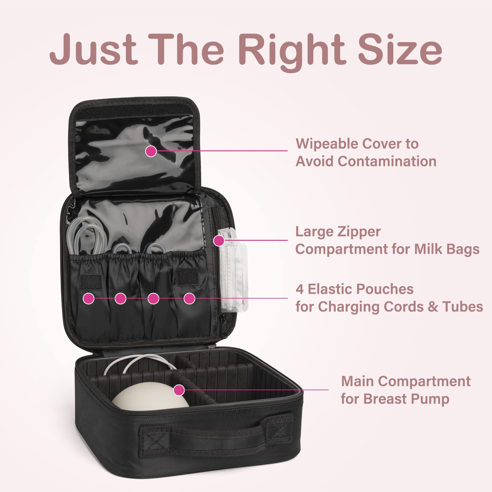 - Q: How much storage space does the Kadamii bag provide? A: The Kadamii bag is designed to hold both of your pumps, tubes, charging cords, and any other breast pump accessories you may need, offering plenty of room for organization.