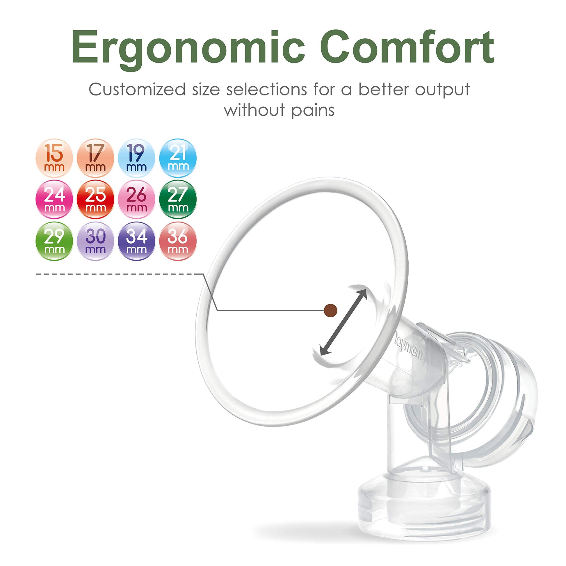 - Q: What size breastshields do these Maymom breastshields come in? A: These Maymom breastshields are available in sizes 19 mm, 21 mm, 25 mm, 26 mm, 27 mm, 29 mm, 30 mm, 34 mm, and 36 mm to fit various pumping needs.