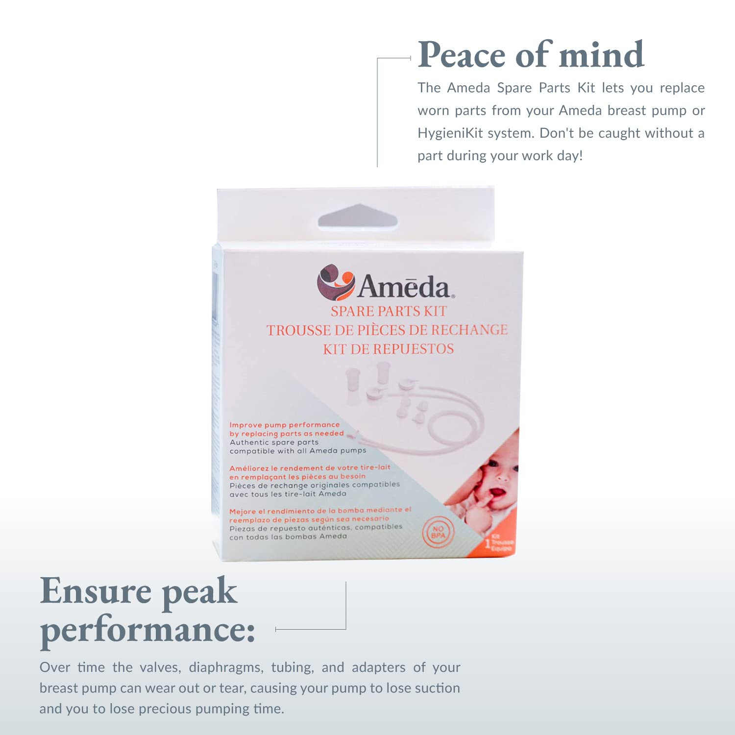 • Q: Is the Ameda Spare Parts Kit compatible with all Ameda breast pumps? A: Yes, the Ameda Spare Parts Kit is compatible with the HygieniKit Milk Collection System and Ameda breast pumps, including the Mya Joy, Mya Joy PLUS, Pearl, and Platinum models.
