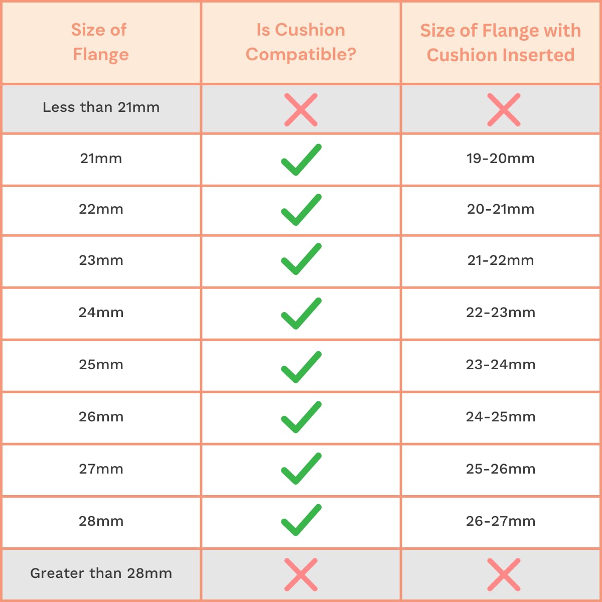- Q: What flange sizes are compatible with BeauGen Breast Pump Cushions? A: BeauGen Breast Pump Cushions are compatible with flange sizes ranging from 21mm to 28mm, reducing the flange size by 1-2mm for a better fit.