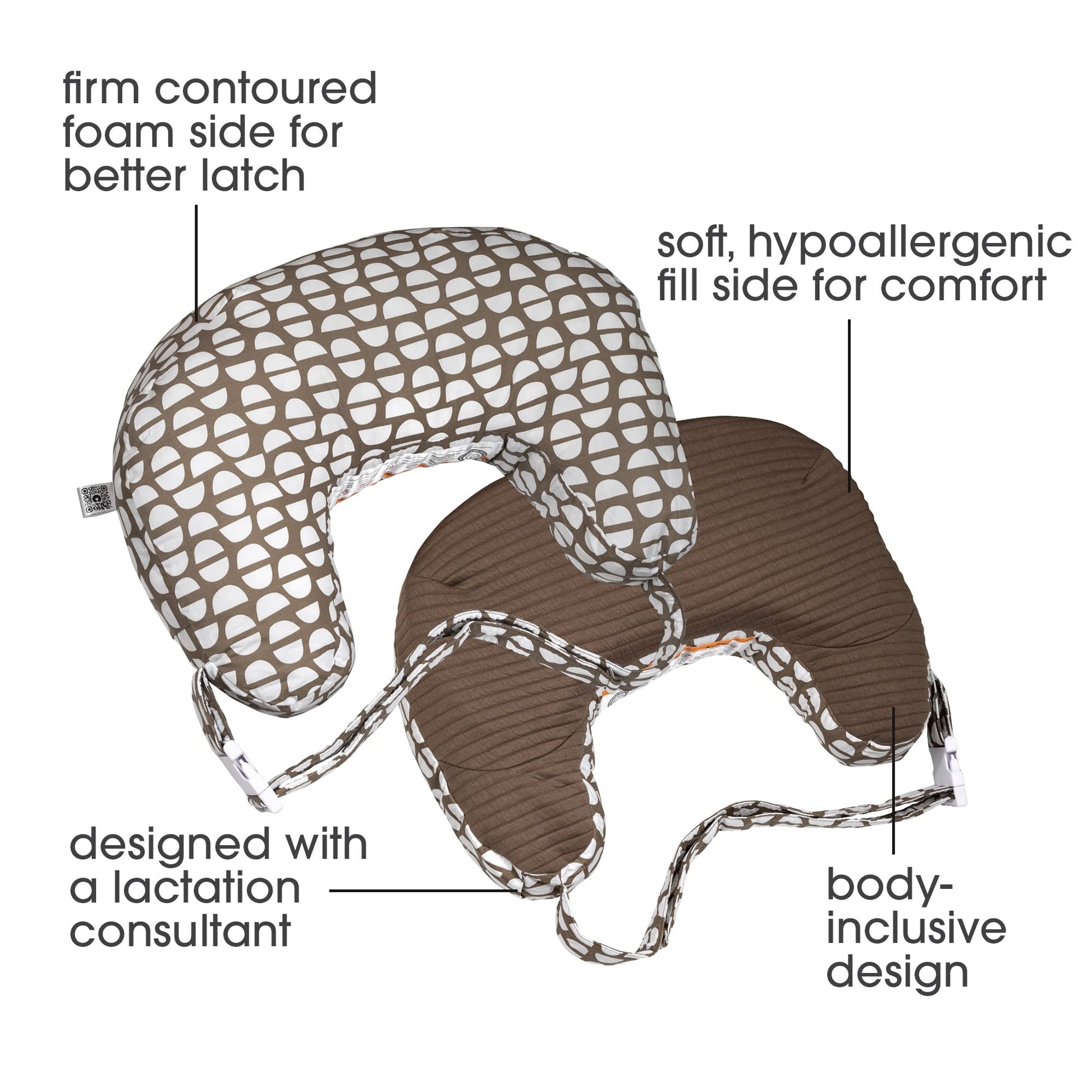 - Q: How does the two-sided design of the pillow work? A: The pillow features a firm contoured foam side that helps position the baby for an easier latch, and a plush side for added comfort as the baby grows.