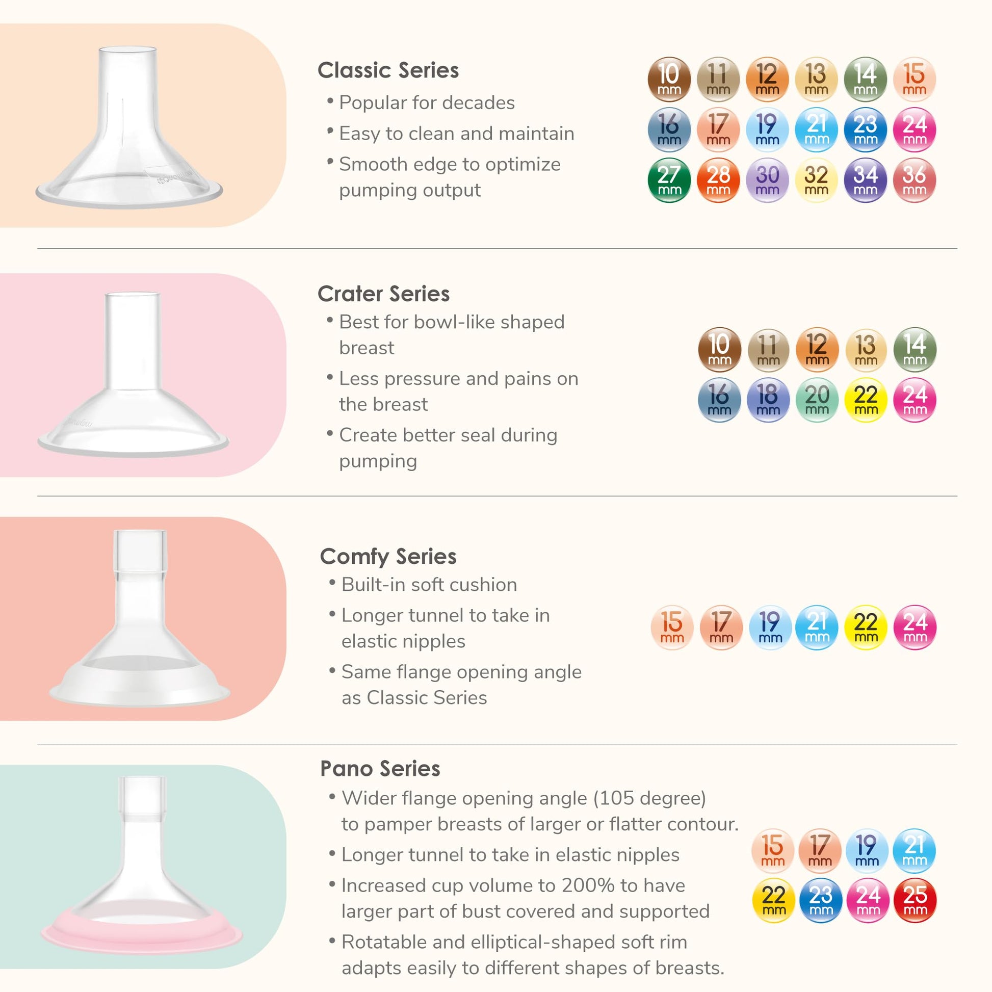 It is well known that using the correct breastshield size is important for your pumping comfort and optimal milk supply. It is also known that two-piece design offers easy to clean and wider compatibility with hands free bra advantages.