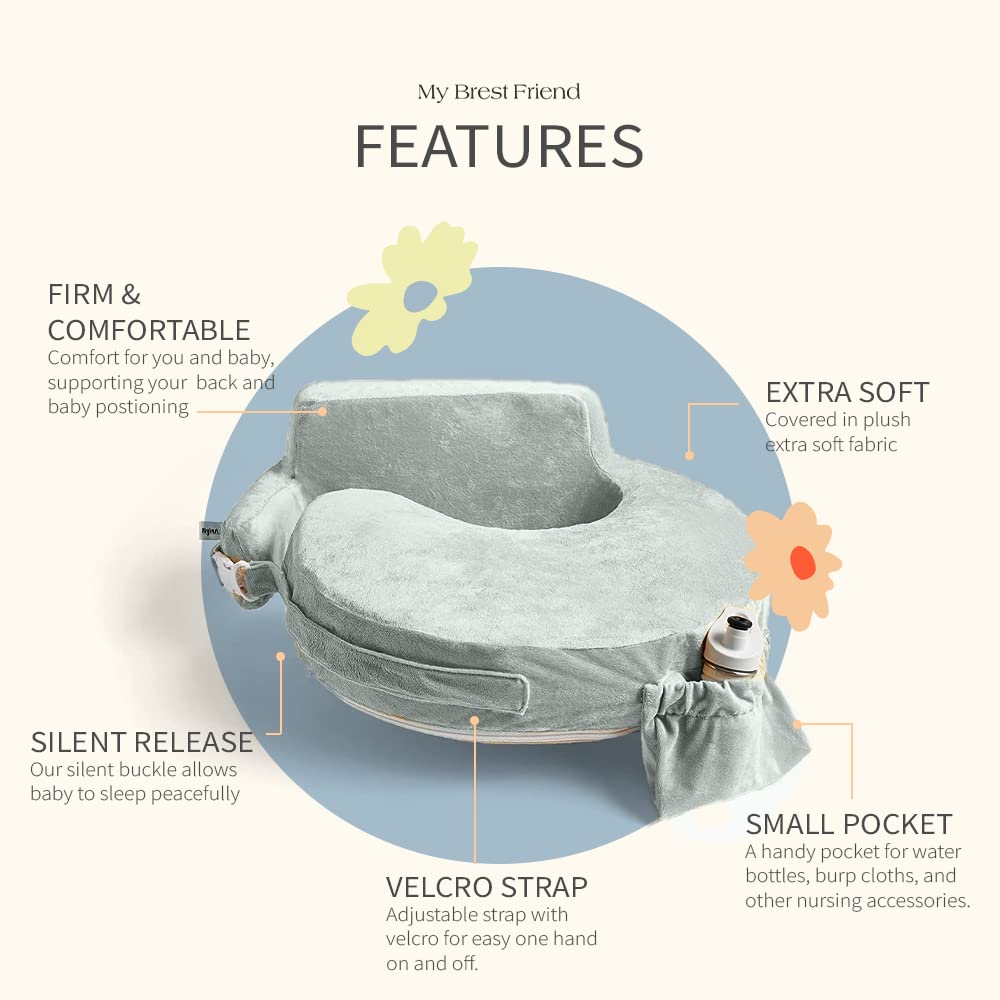 - Q: What materials are used in the My Brest Friend nursing pillow? A: While the product details do not specify materials, it features superior cushion technology for comfort and a plush slipcover for easy maintenance.