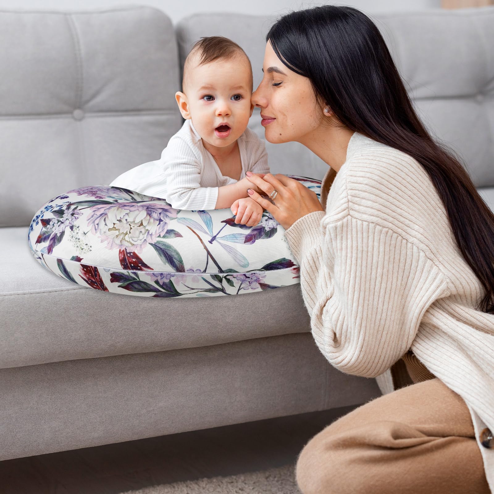 - Q: Does the nursing pillow cover come in different colors or patterns? A: This specific listing features a purple floral wisteria design, but availability may vary depending on the retailer.