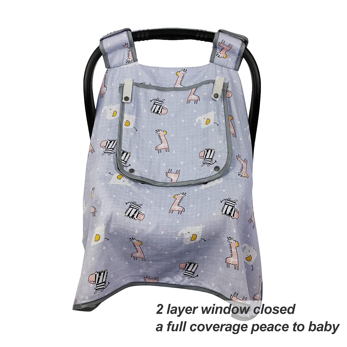 - Q: How does the window feature work? A: The car seat cover includes two mesh windows, allowing parents and babies to see each other while also letting babies enjoy the view outside. The windows can be opened or closed for privacy.