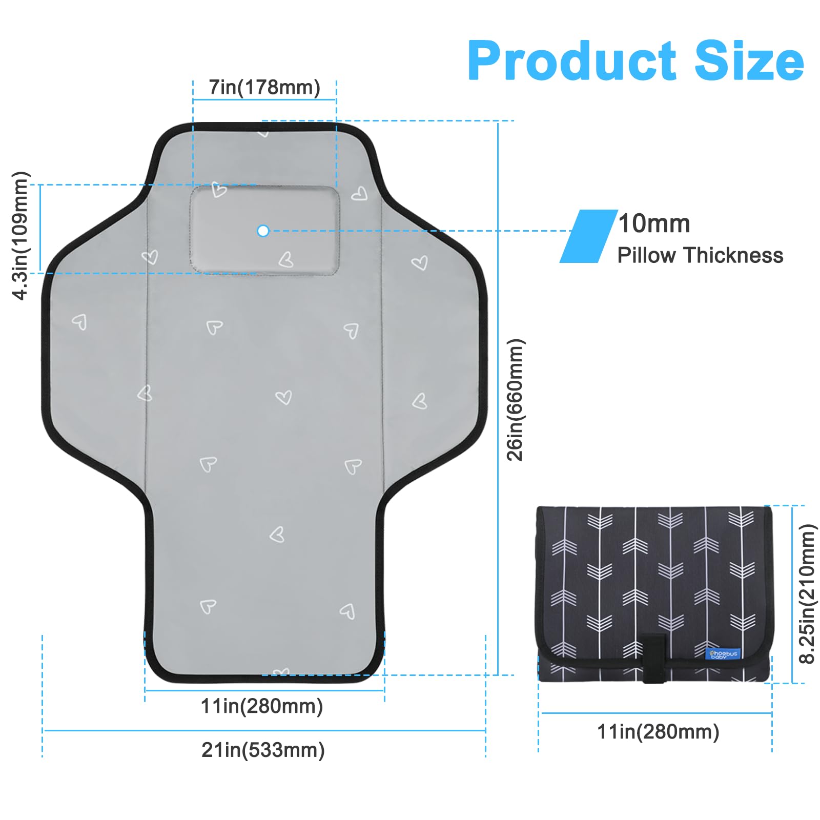 - Q: What are the dimensions of the Baby Portable Changing Pad when folded and unfolded? A: The folded changing pad measures 11 inches by 8.27 inches, and when unfolded, it is 26 inches by 21 inches.