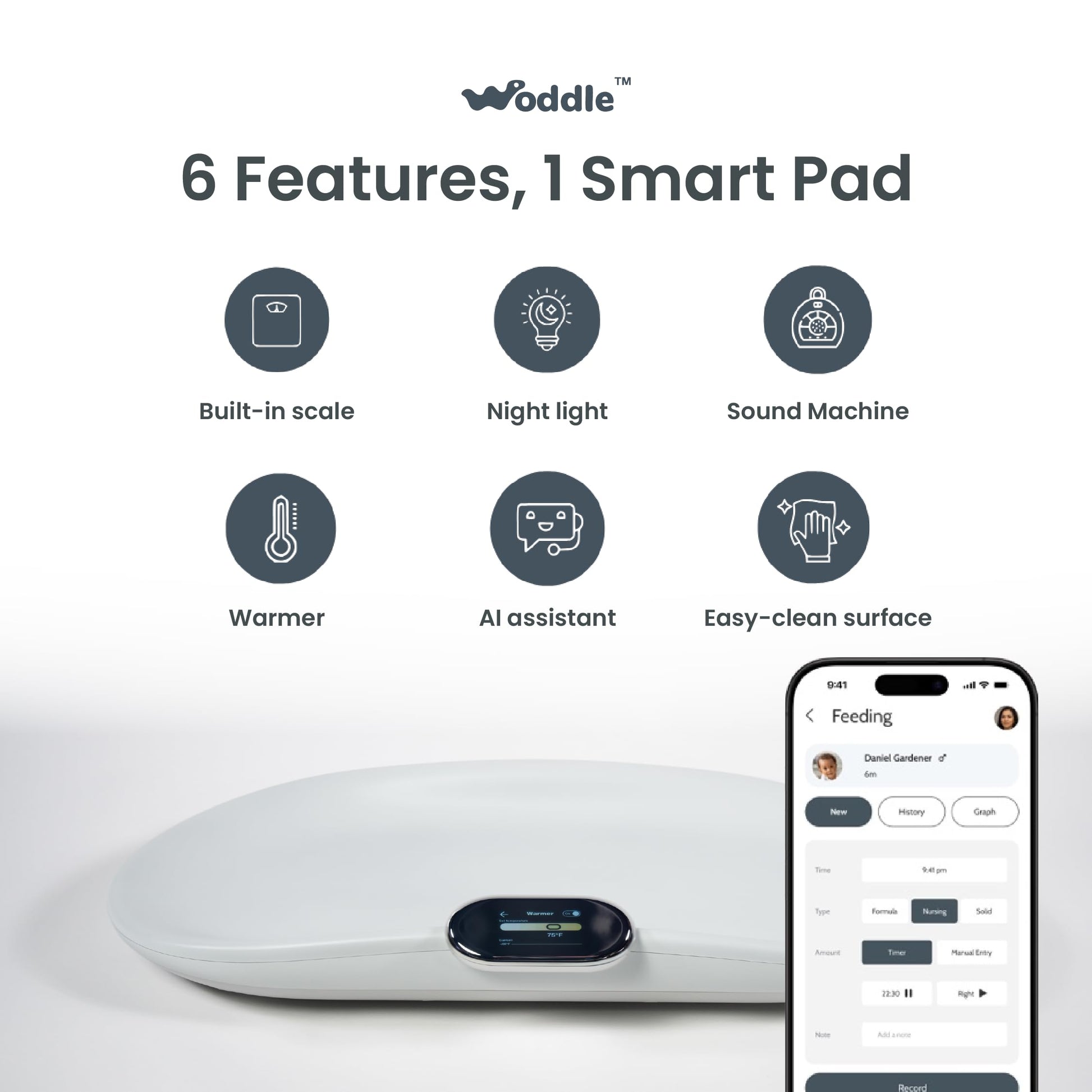 - Q: What are the main features of the Woddle Baby Multifunctional Smart Baby Monitor Changing Pad? A: The main features include a built-in scale for weight tracking, an embedded warmer for comfort, a night light, a noise machine for soothing sounds, and an AI Parent Coach with a touchscreen tracker for monitoring your baby's activities.