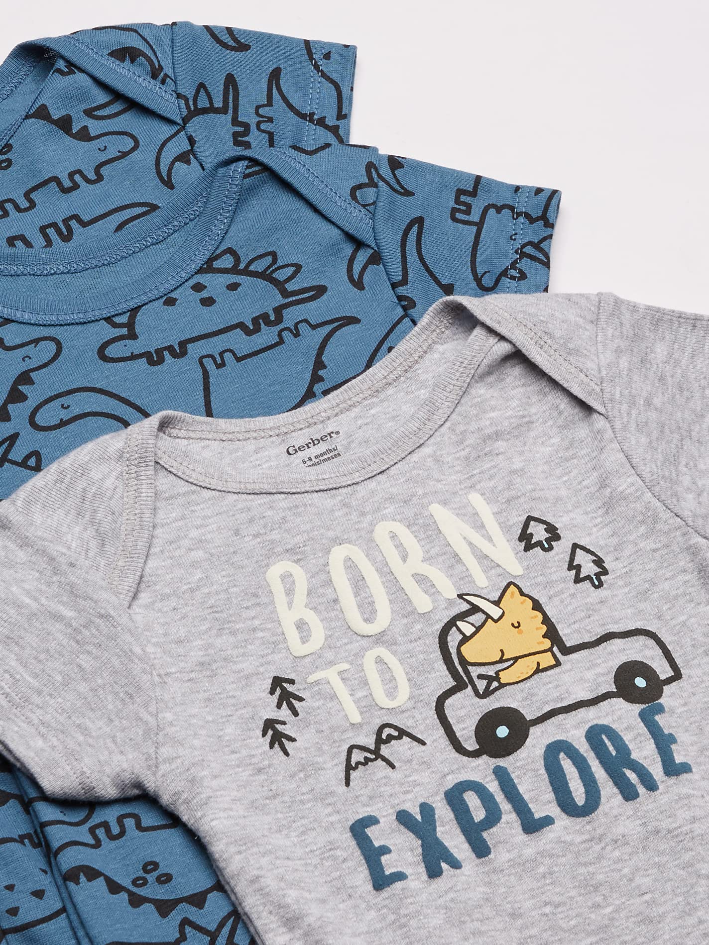 - Q: What is included in the Gerber Baby 8-Pack Short Sleeve Onesies Bodysuits? A: The Gerber Baby 8-Pack includes eight short sleeve onesies, all featuring fun dinosaur designs in a blue color scheme, designed for infants aged 0-3 months.