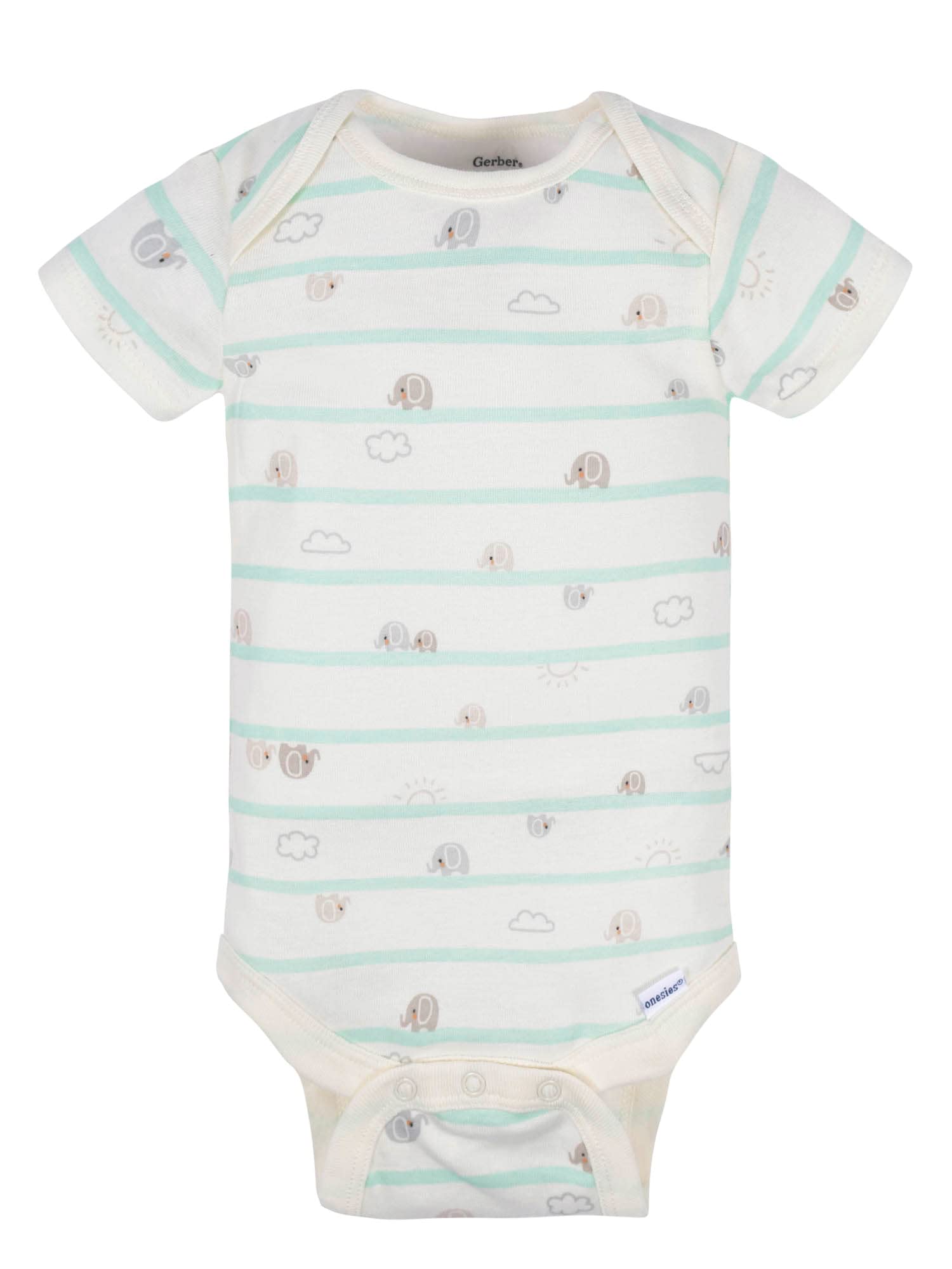 - Q: How many onesies are included in this pack? A: This pack includes eight short sleeve onesies featuring cute elephant designs.