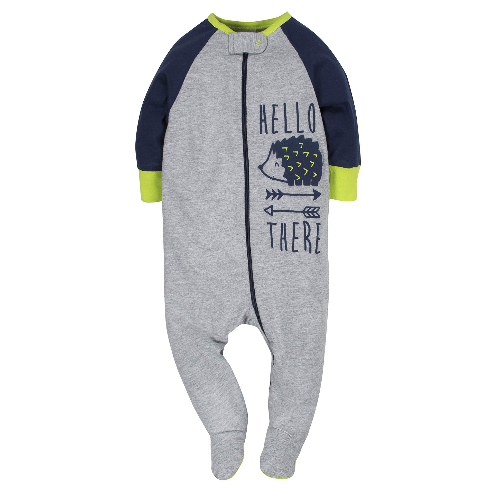 DescriptionGerber Sleep n Plays are the ultimate footie pajamas baby is sure to love! These soft footies are made with 100% cotton, a comfortable fabric thats perfectly breathable to prevent irritation against babys delicate skin. Theyre appropriate to use as newborn footie pajamas as theyre made to comply with all safe sleep standards. Theyre also available in sizes all the way up to 6-9M to fit older or larger babies. Each Gerber Sleep n Play features a zipper down the front of the outfit to allow for easy and fast diaper changes. This zipper makes the baby sleeper incredibly easy to put on as well as to take off. Atop the zipper is a safety tab with a snap to keep the zipper held in place. This reduces irritation caused by babys chin being poked by the zipper. These baby sleepers are footed to add extra warmth which is wonderful for sleepy time as well as if there is a chill in the air. It also means no fooling around with baby socks! These footie pajamas kids will love to wear to bed because of their supreme comfort as well as cute and fun patterns. Available in assorted colors and patterns, theyre suitable baby girl sleepers as well as baby boy sleepers. Babies love the comfortable feel and parents love how cute they look! But these Sleep n Plays arent just for sleep! Theyre wonderful comforatble, casual outfits to wear during the day. They allow babies mobility and provide warmth. Theyre perfect for play but are cute enough to be worn out on the town! These outfits are perfect to wear on a stroll outside, to the grocery store, to day-care, or to grandma and grandpas house! The possibilities are endless! The versatility of these outfits truly gives them a spectacular value that all parents will appreciate. They make an excellent gift for any baby boy or baby girl you know and love! Gerber provides high-quality products that are easy and convenient for parents as well as cute and comfortable for baby. Gerber provides safe products that parents can trust.