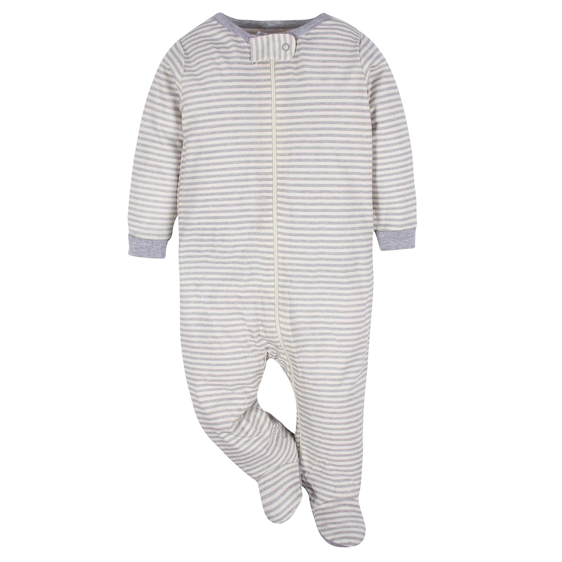DescriptionGerber Sleep n Plays are the ultimate footie pajamas baby is sure to love! These soft footies are made with 100% cotton, a comfortable fabric thats perfectly breathable to prevent irritation against babys delicate skin. Theyre appropriate to use as newborn footie pajamas as theyre made to comply with all safe sleep standards. Theyre also available in sizes all the way up to 6-9M to fit older or larger babies. Each Gerber Sleep n Play features a zipper down the front of the outfit to allow for easy and fast diaper changes. This zipper makes the baby sleeper incredibly easy to put on as well as to take off. Atop the zipper is a safety tab with a snap to keep the zipper held in place. This reduces irritation caused by babys chin being poked by the zipper. These baby sleepers are footed to add extra warmth which is wonderful for sleepy time as well as if there is a chill in the air. It also means no fooling around with baby socks! These footie pajamas kids will love to wear to bed because of their supreme comfort as well as cute and fun patterns. Available in assorted colors and patterns, theyre suitable baby girl sleepers as well as baby boy sleepers. Babies love the comfortable feel and parents love how cute they look! But these Sleep n Plays arent just for sleep! Theyre wonderful comforatble, casual outfits to wear during the day. They allow babies mobility and provide warmth. Theyre perfect for play but are cute enough to be worn out on the town! These outfits are perfect to wear on a stroll outside, to the grocery store, to day-care, or to grandma and grandpas house! The possibilities are endless! The versatility of these outfits truly gives them a spectacular value that all parents will appreciate. They make an excellent gift for any baby boy or baby girl you know and love! Gerber provides high-quality products that are easy and convenient for parents as well as cute and comfortable for baby. Gerber provides safe products that parents can trust.