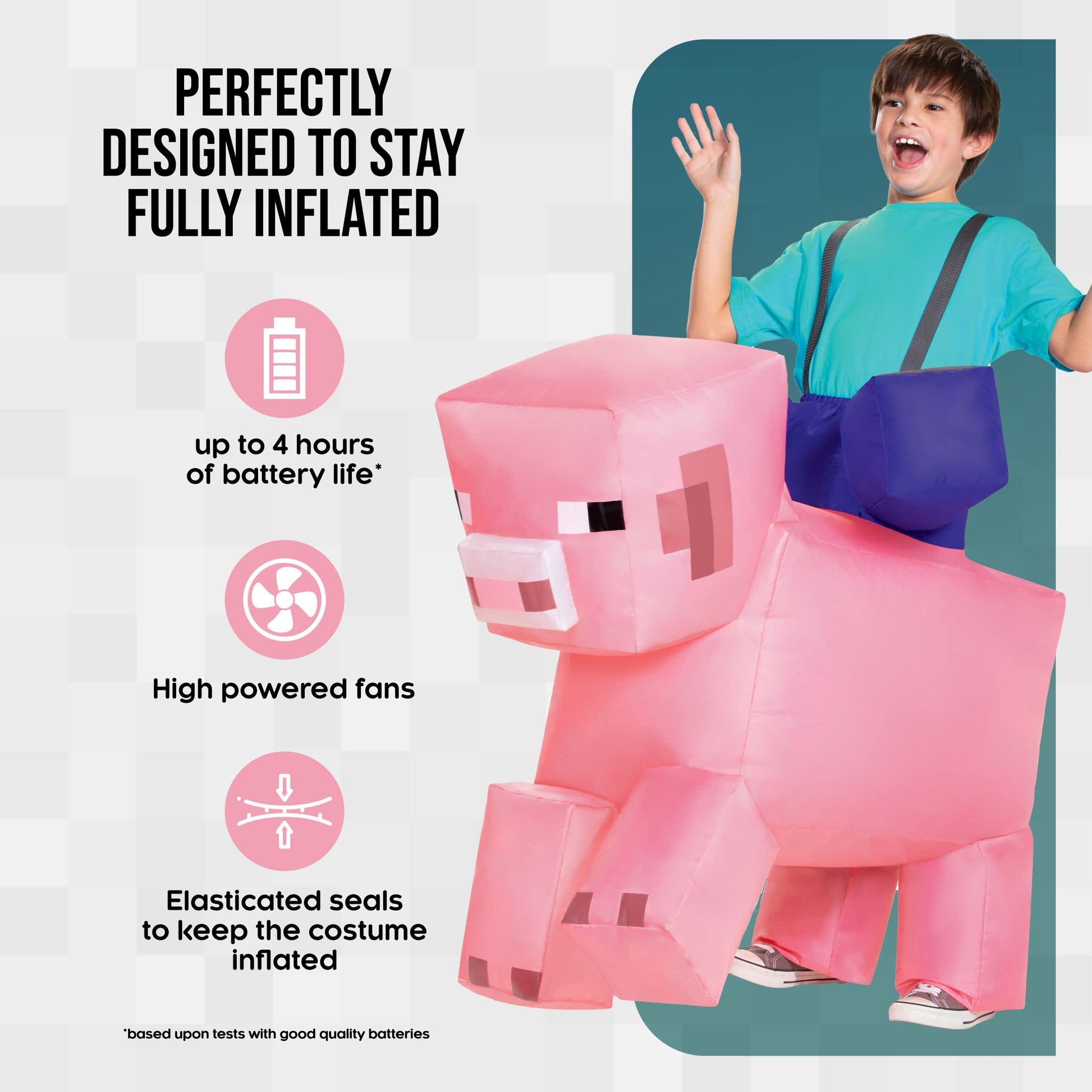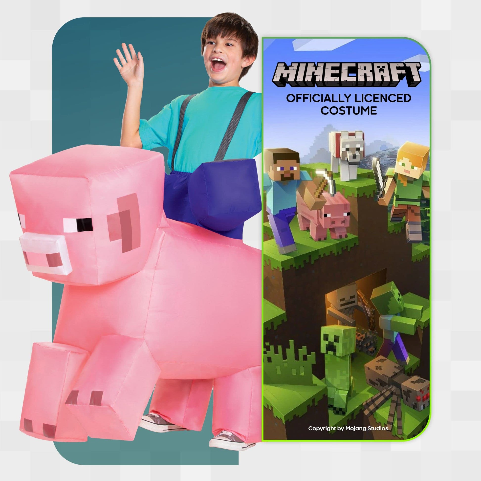 - Q: What is included in the Pig Ride On Minecraft Inflating Costume? A: The Pig Ride On Minecraft Inflating Costume includes a full inflatable jumpsuit, adjustable straps, and a self-inflating fan.