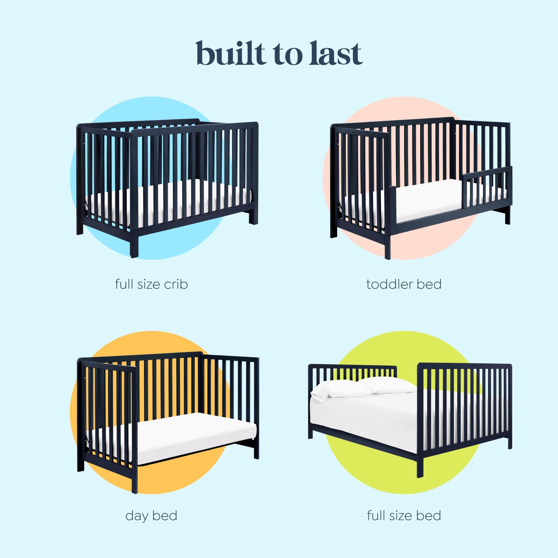 - Q: How does the crib convert to different bed types? A: This crib can be converted into a toddler bed, daybed, and full-size bed. Additional conversion kits are required for the toddler bed and full-size bed.