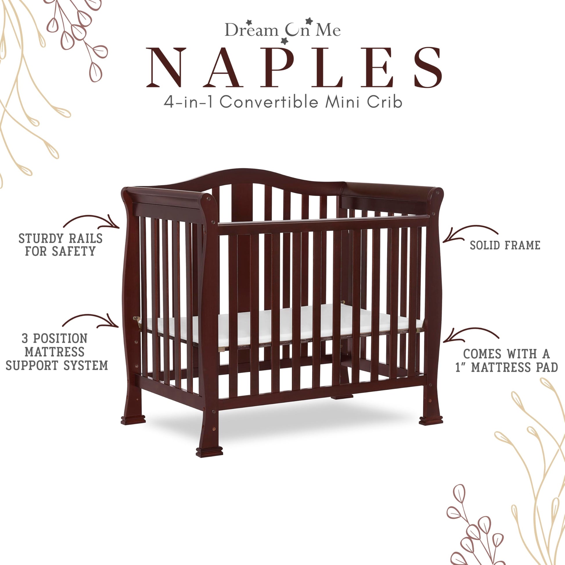 - Q: What are the dimensions of the Dream On Me Addison 4-in-1 Convertible Mini Crib? A: The dimensions of the Dream On Me Addison 4-in-1 Convertible Mini Crib are 38 inches long, 24 inches wide, and 32 inches high.