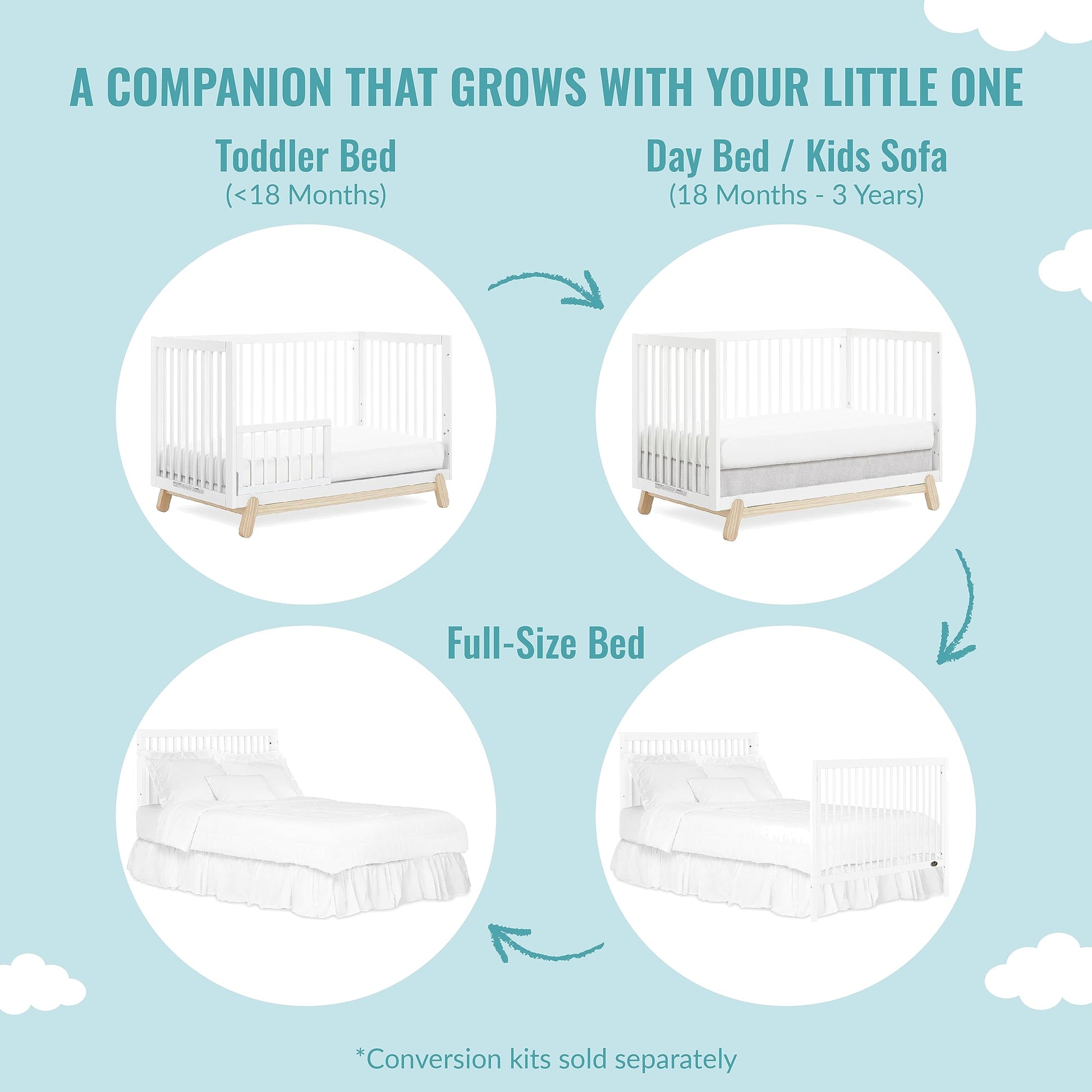 - Q: How does the conversion process work for this crib? A: The crib easily converts from a standard baby crib to a toddler bed, daybed, and full-size bed, allowing it to grow with your child.